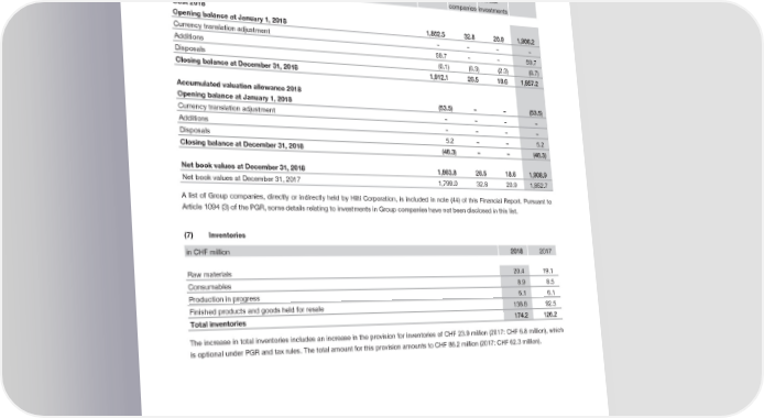 Notes to the Financial Statements Hilti Corporation (6) Financial investments in CHF million Share- Loans to Other Total holdings Group financial companies investments Cost 2018 Opening balance at January 1, 2018 1,852.5 32.8 20.9 1,906.2 Currency translation adjustment – – – – Additions 59.7 – – 59.7 Disposals (0.1) (6.3) (2.3) (8.7) Closing balance at December 31, 2018 1,912.1 26.5 18.6 1,957.2 Accumulated valuation allowance 2018 Opening balance at January 1, 2018 (53.5) – – (53.5) Currency translation adjustment – – – – Additions – – – – Disposals 5.2 – – 5.2 Closing balance at December 31, 2018 (48.3) – – (48.3) Net book values at December 31, 2018 1,863.8 26.5 18.6 1,908.9 Net book values at December 31, 2017 1,799.0 32.8 20.9 1,852.7 A list of Group companies, directly or indirectly held by Hilti Corporation, is included in note (44) of this Financial Report. Pursuant to Article 1094 (3) of the PGR, some details relating to investments in Group companies have not been disclosed in this list. (7) Inventories in CHF million 2018 2017 Raw materials 20.4 19.1 Consumables 8.9 8.5 Production in progress 6.1 6.1 Finished products and goods held for resale 138.8 92.5 Total inventories 174.2 126.2 The increase in total inventories includes an increase in the provision for inventories of CHF 23.9 million (2017: CHF 6.8 million), which is optional under PGR and tax rules. The total amount for this provision amounts to CHF 86.2 million (2017: CHF 62.3 million). 2018 Financial Report | 86