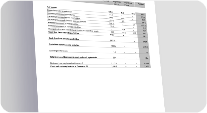 Notes to the Consolidated Financial Statements CONSOLIDATED CASH FLOW STATEMENT FOR THE YEAR ENDING DECEMBER 31, 2017 in CHF million Reported Adjustment Adjustment Restated IFRS 15 IFRS 9 Net income 529.6 (8.3) (0.7) 520.6 Depreciation and amortization 173.5 – – 173.5 (Increase)/decrease in inventories (49.6) (0.9) – (50.5) (Increase)/decrease in trade receivables (60.1) 4.0 – (56.1) (Increase)/decrease in finance lease receivables (144.1) – 0.9 (143.2) Increase/(decrease) in trade payables 65.6 – – 65.6 Increase/(decrease) in contract liabilities – 16.4 – 16.4 Change in other non-cash items and other net operating assets 95.8 (11.2) (0.2) 84.4 Cash flow from operating activities 610.7 – – 610.7 Cash flow from investing activities (413.1) – – (413.1) Cash flow from financing activities (178.7) – – (178.7) Exchange differences 7.5 – – 7.5 Total increase/(decrease) in cash and cash equivalents 26.4 – – 26.4 Cash and cash equivalents at January 1 1,113.8 – – 1,113.8 Cash and cash equivalents at December 31 1,140.2 – – 1,140.2 2018 Financial Report | 25