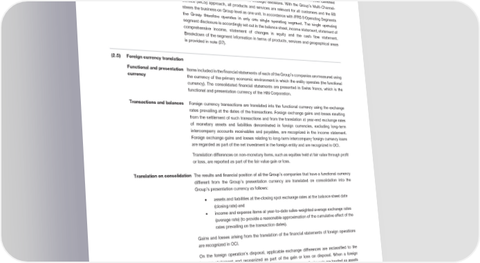 Notes to the Consolidated Financial Statements Segment reporting Operating segments are reported in a manner consistent with the internal reporting provided to (2.4) the chief operating decision-maker. The chief operating decision-maker, who is responsible for allocating resources and assessing performance of the operating segments, has been identified as the Executive Board (EB) that makes strategic decisions. With the Group’s Multi-Channel- Service (MCS) approach, all products and services are relevant for all customers and the EB steers the business on Group level as one unit. In accordance with IFRS 8 Operating Segments the Group therefore operates in only one single operating segment. The single operating segment disclosure is accordingly set out in the balance sheet, income statement, statement of comprehensive income, statement of changes in equity and the cash flow statement. Breakdown of the segment information in terms of products, services and geographical areas is provided in note (37). (2.5) Foreign currency translation Functional and presentation Items included in the financial statements of each of the Group’s companies are measured using currency the currency of the primary economic environment in which the entity operates (the functional currency). The consolidated financial statements are presented in Swiss francs, which is the functional and presentation currency of the Hilti Corporation. Transactions and balances Foreign currency transactions are translated into the functional currency using the exchange rates prevailing at the dates of the transactions. Foreign exchange gains and losses resulting from the settlement of such transactions and from the translation at year-end exchange rates of monetary assets and liabilities denominated in foreign currencies, excluding long-term intercompany accounts receivables and payables, are recognized in the income statement. Foreign exchange gains and losses relating to long-term intercompany foreign currency loans are regarded as part of the net investment in the foreign entity and are recognized in OCI. Translation differences on non-monetary items, such as equities held at fair value through profit or loss, are reported as part of the fair value gain or loss. Translation on consolidation The results and financial position of all the Group’s companies that have a functional currency different from the Group’s presentation currency are translated on consolidation into the Group’s presentation currency as follows: • assets and liabilities at the closing spot exchange rates at the balance sheet date (closing rate) and • income and expense items at year-to-date sales-weighted average exchange rates (average rate) (to provide a reasonable approximation of the cumulative effect of the rates prevailing on the transaction dates). Gains and losses arising from the translation of the financial statements of foreign operations are recognized in OCI. On the foreign operation’s disposal, applicable exchange differences are reclassified to the income statement and recognized as part of the gain or loss on disposal. When a foreign operation is acquired, any applicable goodwill and fair value adjustments are treated as assets and liabilities of the foreign entity and are translated at the closing rate. 2018 Financial Report | 27