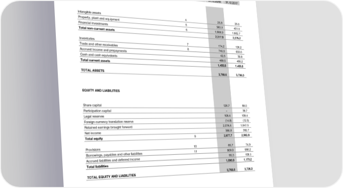 Financial Statements Hilti Corporation BALANCE SHEET in CHF million Note 31.12.2018 31.12.2017 ASSETS Intangible assets 4 25.8 25.0 Property, plant and equipment 5 383.1 401.5 Financial investments 6 1,908.9 1,852.7 Total non-current assets 2,317.8 2,279.2 Inventories 7 174.2 126.2 Trade and other receivables 8 745.5 833.6 Accrued income and prepayments 42.6 30.8 Cash and cash equivalents 488.5 466.2 Total current assets 1,450.8 1,456.8 TOTAL ASSETS 3,768.6 3,736.0 EQUITY AND LIABILITIES Share capital 126.7 88.0 Participation capital – 38.7 Legal reserves 108.4 108.4 Foreign currency translation reserve (14.8) (12.5) Retained earnings brought forward 2,076.6 1,947.5 Net income 380.8 392.7 Total equity 9 2,677.7 2,562.8 Provisions 10 85.7 74.9 Borrowings, payables and other liabilities 11 909.9 990.2 Accrued liabilities and deferred income 95.3 108.1 Total liabilities 1,090.9 1,173.2 TOTAL EQUITY AND LIABILITIES 3,768.6 3,736.0 2018 Financial Report | 81