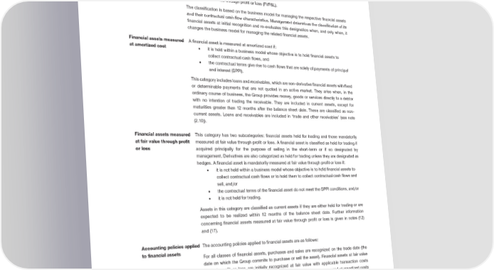 Notes to the Consolidated Financial Statements Financial assets For the purpose of identifying accounting policies applied, after initial recognition, financial (2.8) assets are classified as subsequently measured: • at amortized cost and • at fair value through profit or loss (FVP&L). The classification is based on the business model for managing the respective financial assets and their contractual cash flow characteristics. Management determines the classification of its financial assets at initial recognition and re-evaluates this designation when, and only when, it changes the business model for managing the related financial assets. Financial assets measured A financial asset is measured at amortized cost if: at amortized cost • it is held within a business model whose objective is to hold financial assets to collect contractual cash flows, and • the contractual terms give rise to cash flows that are solely of payments of principal and interest (SPPI). This category includes loans and receivables, which are non-derivative financial assets with fixed or determinable payments that are not quoted in an active market. They arise when, in the ordinary course of business, the Group provides money, goods or services directly to a debtor with no intention of trading the receivable. They are included in current assets, except for maturities greater than 12 months after the balance sheet date. These are classified as non- current assets. Loans and receivables are included in ‘trade and other receivables’ (see note (2.10)). Financial assets measured This category has two subcategories: financial assets held for trading and those mandatorily at fair value through profit measured at fair value through profit or loss. A financial asset is classified as held for trading if or loss acquired principally for the purpose of selling in the short-term or if so designated by management. Derivatives are also categorized as held for trading unless they are designated as hedges. A financial asset is mandatorily measured at fair value through profit or loss if: • it is not held within a business model whose objective is to hold financial assets to collect contractual cash flows or to hold them to collect contractual cash flows and sell, and/or • the contractual terms of the financial asset do not meet the SPPI conditions, and/or • it is not held for trading. egory are classified as current assets if they are either held for trading or are Assets in this cat expected to be realized within 12 months of the balance sheet date. Further information concerning financial assets measured at fair value through profit or loss is given in notes (12) and (17). Accounting policies applied The accounting policies applied to financial assets are as follows: to financial assets For all classes of financial assets, purchases and sales are recognized on the trade date (the date on which the Group commits to purchase or sell the asset). Financial assets at fair value through profit or loss are initially recognized at fair value with applicable transaction costs immediately recognized in the income statement. Financial assets measured at amortized costs are initially recognized at fair value plus directly attributable transaction costs. Trade receivables that do not have a significant financing component are initially measured at their transaction price. Financial assets are derecognized when the rights to receive cash flows from the assets have expired or have been transferred and the Group has transferred substantially all risks and rewards of ownership. using After initial recognition, loans and receivables are measured at amortized cost determined the effective interest method less allowances for expected credit losses (ECL). Financial assets at fair value through profit or loss are subsequently measured at fair value, with realized and 2018 Financial Report | 29