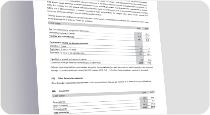 Notes to the Consolidated Financial Statements The category inventories includes the tax effects of temporary differences arising on unrealized intercompany profits, as well as those arising on differences between tax and accounting treatment regarding inventory measurements at the legal entity. The category fixed and intangible assets includes the tax effects of temporary differences arising both on intangible assets and property, plant and equipment. The category provisions and employee benefits includes items charged/credited to OCI which are tax effects of temporary differences arising on remeasurements on defined benefit pension plans. The category receivables includes tax effects on temporary differences arising on fleet management sales/receivables due to the different treatment in some tax legislations (operating lease) and IFRS (finance lease), as well as on differences between tax and accounting treatment regarding receivable measurements at the legal entity. The category ‘accounts payable and contract liabilities’ mainly includes tax effects on temporary differences arising on contract liability due to different treatment of revenue recognition in some tax legislations. The category ‘other’ mainly includes tax effects on temporary differences arising on accruals and financial instruments. Deferred income tax assets are recognized for tax loss carryforwards to the extent that the realization of the related tax benefit through future taxable profits is probable. Details are as follows: in CHF million 2018 2017 Tax loss carryforwards recognized in deferred tax 52.2 46.9 Unused tax loss carryforwards 23.8 34.7 Total tax loss carryforwards 76.0 81.6 Expiration of unused tax loss carryforwards: Expiration < 1 year 3.8 4.5 Expiration > 1 year to < 5 years 1.6 3.3 Expiration > 5 years or no expiration date 18.4 26.9 Tax effect of unused tax loss carryforwards 8.3 10.4 Unremitted earnings subject to withholding tax or other taxes 205.0 113.0 Deferred income tax liabilities have not been recognized for the withholding tax and other taxes that would be payable on the unremitted earnings of certain subsidiaries totaling CHF 205.0 million (2017: CHF 113.0 million). Such amounts are permanently reinvested. (12) Other financial investments Other financial investments comprise mainly other investments in equities and are classified as at fair value through profit and loss. Inventories (13) in CHF million 2018 2017* Raw materials 66.5 55.6 Work in progress 10.1 8.8 Finished goods 602.0 573.2 Total inventories 678.6 637.6 * Restated, see note 2.2 The change in inventories includes a currency translation adjustment which decreases the inventories by CHF 16.4 million in 2018. This is due to the change in closing rates in 2018 compared to those in 2017. The allowance made for possible inventory losses due to age and obsolescence totals CHF 54.7 million (2017: CHF 45.9 million). The change in the allowance recognized in the income statement is CHF -10.6 million (2017: CHF -5.5 million). This change is included in the line ‘change in inventory’. 2018 Financial Report | 47