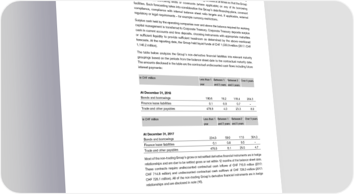 Notes to the Consolidated Financial Statements Liquidity risk Cash flow forecasting is performed in the operating companies of the Group and aggregated by Corporate Treasury. Corporate Treasury monitors rolling forecasts of the Group’s liquidity requirements to ensure it has sufficient cash to meet operational needs while maintaining sufficient headroom on its undrawn established borrowing facilities at all times so that the Group does not breach borrowing limits or covenants (where applicable) on any of its borrowing facilities. Such forecasting takes into consideration the Group’s debt financing plans, covenant compliance, compliance with internal balance sheet ratio targets and, if applicable, external regulatory or legal requirements – for example currency restrictions. balance required for working Surplus cash held by the operating companies over and above the capital management is transferred to Corporate Treasury. Corporate Treasury deposits surplus cash in current accounts and time deposits, choosing instruments with appropriate maturities or sufficient liquidity to provide sufficient headroom as determined by the above-mentioned forecasts. At the reporting date, the Group held liquid funds of CHF 1,030.9 million (2017: CHF 1,140.2 million). derivative financial liabilities into relevant maturity The table below analyzes the Group’s non- groupings based on the periods from the balance sheet date to the contractual maturity date. The amounts disclosed in the table are the contractual undiscounted cash flows including future interest payments: in CHF million Less than 1 Between 1 Between 2 Over 5 years year and 2 years and 5 years At December 31, 2018 Bonds and borrowings 190.6 19.2 118.4 204.3 Finance lease liabilities 0.1 0.9 0.7 – Trade and other payables 478.9 4.0 23.3 8.0 in CHF million Less than 1 Between 1 Between 2 Over 5 years year and 2 years and 5 years At December 31, 2017 Bonds and borrowings 234.0 59.0 17.6 304.3 Finance lease liabilities 0.1 0.8 0.5 – Trade and other payables 479.0 8.1 26.5 4.7 Most of the non-trading Group’s gross or net settled derivative financial instruments are in hedge relationships and are due to be settled gross or net within 12 months of the balance sheet date. These contracts require undiscounted contractual cash inflows of CHF 719.9 million (2017: CHF 714.8 million) and undiscounted contractual cash outflows of CHF 728.0 million (2017: CHF 728.1 million). All of the non-trading Group’s derivative financial instruments are in hedge relationships and are disclosed in note (16). 2018 Financial Report | 35