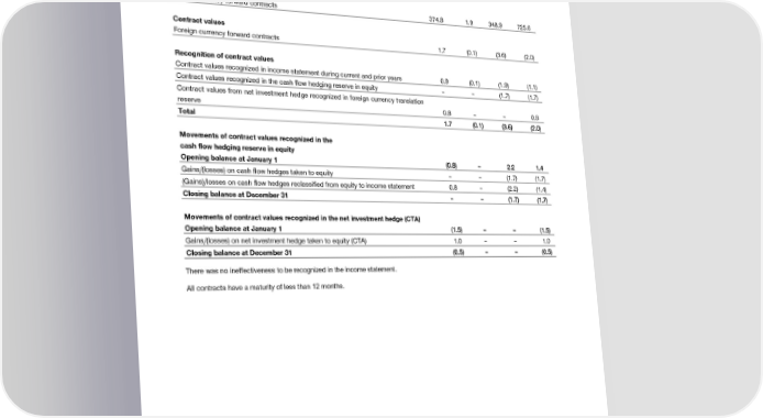 Notes to the Consolidated Financial Statements in CHF million USD EUR Other Total 2017 Contract face amounts Foreign currency forward contracts 374.8 1.9 348.9 725.6 Contract values Foreign currency forward contracts 1.7 (0.1) (3.6) (2.0) Recognition of contract values Contract values recognized in income statement during current and prior years 0.9 (0.1) (1.9) (1.1) Contract values recognized in the cash flow hedging reserve in equity – – (1.7) (1.7) Contract values from net investment hedge recognized in foreign currency translation reserve 0.8 – – 0.8 Total 1.7 (0.1) (3.6) (2.0) Movements of contract values recognized in the cash flow hedging reserve in equity Opening balance at January 1 (0.8) – 2.2 1.4 Gains/(losses) on cash flow hedges taken to equity – – (1.7) (1.7) (Gains)/losses on cash flow hedges reclassified from equity to income statement 0.8 – (2.2) (1.4) Closing balance at December 31 – – (1.7) (1.7) Movements of contract values recognized in the net investment hedge (CTA) Opening balance at January 1 (1.5) – – (1.5) Gains/(losses) on net investment hedge taken to equity (CTA) 1.0 – – 1.0 Closing balance at December 31 (0.5) – – (0.5) There was no ineffectiveness to be recognized in the income statement. All contracts have a maturity of less than 12 months. 2018 Financial Report | 51