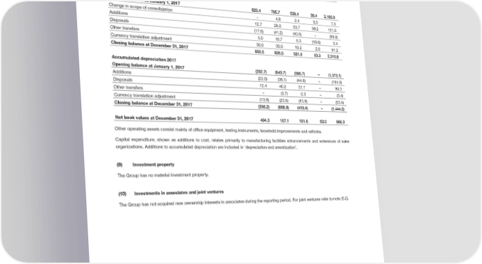 Notes to the Consolidated Financial Statements in CHF million Land and Plant and Other Assets Total buildings machinery operating under con- assets struction Cost 2017 Opening balance at January 1, 2017 820.4 795.7 539.4 30.4 2,185.9 Change in scope of consolidation – 4.8 2.4 0.3 7.5 Additions 12.7 26.0 53.7 39.2 131.6 Disposals (17.6) (41.2) (40.0) – (98.8) Other transfers 5.0 10.7 6.3 (18.6) 3.4 Currency translation adjustment 30.0 30.0 19.2 2.0 81.2 Closing balance at December 31, 2017 850.5 826.0 581.0 53.3 2,310.8 Accumulated depreciation 2017 Opening balance at January 1, 2017 (332.7) (643.7) (396.7) – (1,373.1) Additions (22.0) (38.1) (44.8) – (104.9) Disposals 12.4 40.2 37.7 – 90.3 Other transfers – (3.7) 0.3 – (3.4) Currency translation adjustment (13.9) (23.6) (15.9) – (53.4) Closing balance at December 31, 2017 (356.2) (668.9) (419.4) – (1,444.5) Net book values at December 31, 2017 494.3 157.1 161.6 53.3 866.3 Other operating assets consist mainly of office equipment, testing instruments, leasehold improvements and vehicles. Capital expenditure, shown as additions to cost, relates primarily to manufacturing facilities enhancements and extensions of sales organizations. Additions to accumulated depreciation are included in ‘depreciation and amortization’. (9) Investment property The Group has no material investment property. (10) Investments in associates and joint ventures The Group has not acquired new ownership interests in associates during the reporting period. For joint ventures refer to note (5.2). 2018 Financial Report | 45