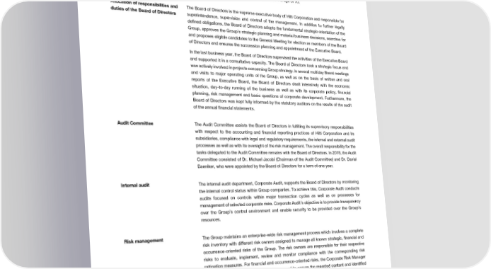 Corporate Governance Election and term of office for the The members of the Board of Directors of Hilti Corporation are elected by the Annual General members of the Board of Directors Meeting for three years. In principle, the term of office shall amount to not more than four terms and the mandate of a member of the Board of Directors shall lapse with effect at the end of the business year in which the relevant member reaches the age of 70. Allocation of responsibilities and The Board of Directors is the supreme executive body of Hilti Corporation and responsible for duties of the Board of Directors superintendence, supervision and control of the management. In addition to further legally defined obligations, the Board of Directors adopts the fundamental strategic orientation of the Group, approves the Group’s strategic planning and material business decisions, searches for and proposes eligible candidates to the General Meeting for election as members of the Board of Directors and ensures the succession planning and appointment of the Executive Board. In the last business year, the Board of Directors supervised the activities of the Executive Board and supported it in a consultative capacity. The Board of Directors took a strategic focus and was actively involved in projects concerning Group strategy. In several multiday Board meetings and visits to major operating units of the Group, as well as on the basis of written and oral reports of the Executive Board, the Board of Directors dealt intensively with the economic situation, day-to-day running of the business as well as with its corporate policy, financial planning, risk management and basic questions of corporate development. Furthermore, the Board of Directors was kept fully informed by the statutory auditors on the results of the audit of the annual financial statements. Audit Committee The Audit Committee assists the Board of Directors in fulfilling its supervisory responsibilities with respect to the accounting and financial reporting practices of Hilti Corporation and its subsidiaries, compliance with legal and regulatory requirements, the internal and external audit processes as well as with its oversight of the risk management. The overall responsibility for the tasks delegated to the Audit Committee remains with the Board of Directors. In 2018, the Audit Committee consisted of Dr. Michael Jacobi (Chairman of the Audit Committee) and Dr. Daniel Daeniker, who were appointed by the Board of Directors for a term of one year. Internal audit The internal audit department, Corporate Audit, supports the Board of Directors by monitoring the internal control status within Group companies. To achieve this, Corporate Audit conducts audits focused on controls within major transaction cycles as well as on processes for management of selected corporate risks. Corporate Audit’s objective is to provide transparency over the Group’s control environment and enable security to be provided over the Group’s resources. Risk management The Group maintains an enterprise-wide risk management process which involves a complete risk inventory with different risk owners assigned to manage all known strategic, financial and occurrence-oriented risks of the Group. The risk owners are responsible for their respective risks to evaluate, implement, review and monitor compliance with the corresponding risk mitigation measures. For financial and occurrence-oriented risks, the Corporate Risk Manager is responsible for the risk reporting process and to ensure the reported content and identified measures regarding the identified risks are plausible. Corporate Audit undertakes reviews of selected risks as part of their internal control reviews in Group companies (see above) and in corporate functions managed by the respective risk owners. For strategic risks, Corporate Development runs annual strategy review workshops with the Executive Board. The risk management reporting is regularly reviewed by the Audit Committee, on behalf of the Board of Directors. 2018 Financial Report | 97