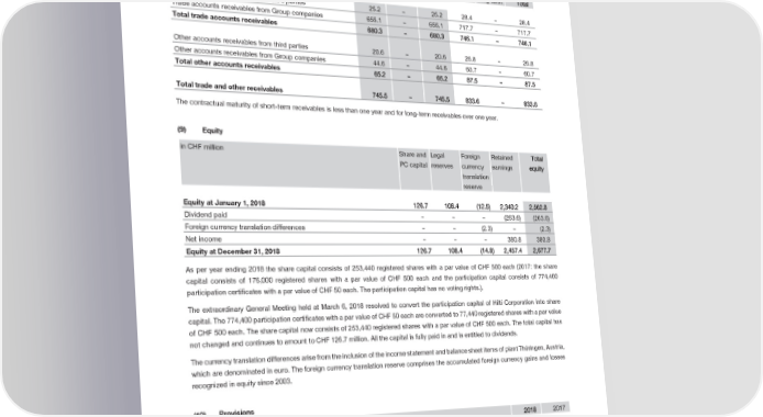 Notes to the Financial Statements Hilti Corporation (8) Trade and other receivables in CHF million 2018 2017 Short-term Long-term Total Short-term Long-term Total Trade accounts receivables from third parties 25.2 – 25.2 28.4 – 28.4 Trade accounts receivables from Group companies 655.1 – 655.1 717.7 – 717.7 Total trade accounts receivables 680.3 – 680.3 746.1 – 746.1 Other accounts receivables from third parties 20.6 – 20.6 26.8 – 26.8 Other accounts receivables from Group companies 44.6 – 44.6 60.7 – 60.7 Total other accounts receivables 65.2 – 65.2 87.5 – 87.5 Total trade and other receivables 745.5 – 745.5 833.6 – 833.6 The contractual maturity of short-term receivables is less than one year and for long-term receivables over one year. Equity (9) in CHF million Share and Legal Foreign Retained Total PC capital reserves currency earnings equity translation reserve Equity at January 1, 2018 126.7 108.4 (12.5) 2,340.2 2,562.8 Dividend paid – – – (263.6) (263.6) Foreign currency translation differences – – (2.3) – (2.3) Net income – – – 380.8 380.8 Equity at December 31, 2018 126.7 108.4 (14.8) 2,457.4 2,677.7 As per year ending 2018 the share capital consists of 253,440 registered shares with a par value of CHF 500 each (2017: the share capital consists of 176,000 registered shares with a par value of CHF 500 each and the participation capital consists of 774,400 participation certificates with a par value of CHF 50 each. The participation capital has no voting rights.). The extraordinary General Meeting held at March 6, 2018 resolved to convert the participation capital of Hilti Corporation into share capital. The 774,400 participation certificates with a par value of CHF 50 each are converted to 77,440 registered shares with a par value of CHF 500 each. The share capital now consists of 253,440 registered shares with a par value of CHF 500 each. The total capital has not changed and continues to amount to CHF 126.7 million. All the capital is fully paid in and is entitled to dividends. The currency translation differences arise from the inclusion of the income statement and balance sheet items of plant Thüringen, Austria, which are denominated in euro. The foreign currency translation reserve comprises the accumulated foreign currency gains and losses recognized in equity since 2003. (10) Provisions in CHF million 2018 2017 Provision for employee benefits 45.1 33.8 Tax obligations 30.5 35.8 Other provisions 10.1 5.3 Total provisions 85.7 74.9 Other provisions relate mainly to product liability. 2018 Financial Report | 87