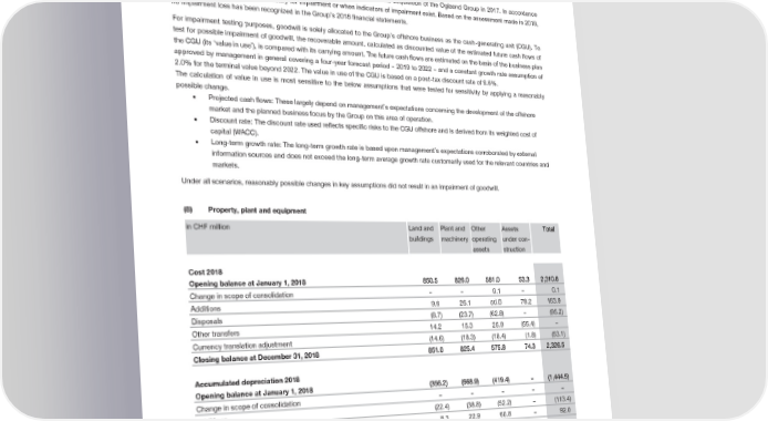 Notes to the Consolidated Financial Statements Of intangible assets, only development costs are internally generated, all other intangible assets are acquired. Other intangible assets consist mainly of patents, brands, customer lists and database/application software licenses. Additions to accumulated amortization and impairment losses are included in depreciation and amortization. The goodwill of CHF 100.6 million (2017: CHF 105.6 million) arises from the acquisition of the Oglaend Group in 2017. In accordance with IAS 36, goodwill is tested annually for impairment or when indicators of impairment exist. Based on the assessment made in 2018, no impairment loss has been recognized in the Group’s 2018 financial statements. For impairment testing purposes, goodwill is solely allocated to the Group’s offshore business as the cash-generating unit (CGU). To test for possible impairment of goodwill, the recoverable amount, calculated as discounted value of the estimated future cash flows of the CGU (its ‘value in use’), is compared with its carrying amount. The future cash flows are estimated on the basis of the business plan approved by management in general covering a four-year forecast period – 2019 to 2022 – and a constant growth rate assumption of 2.0% for the terminal value beyond 2022. The value in use of the CGU is based on a post-tax discount rate of 9.6%. The calculation of value in use is most sensitive to the below assumptions that were tested for sensitivity by applying a reasonably possible change. • Projected cash flows: These largely depend on management’s expectations concerning the development of the offshore market and the planned business focus by the Group on this area of operation. • Discount rate: The discount rate used reflects specific risks to the CGU offshore and is derived from its weighted cost of capital (WACC). • Long-term growth rate: The long-term growth rate is based upon management’s expectations corroborated by external information sources and does not exceed the long-term average growth rate customarily used for the relevant countries and markets. Under all scenarios, reasonably possible changes in key assumptions did not result in an impairment of goodwill. Property, plant and equipment (8) in CHF million Land and Plant and Other Assets Total buildings machinery operating under con- assets struction Cost 2018 Opening balance at January 1, 2018 850.5 826.0 581.0 53.3 2,310.8 Change in scope of consolidation – – 0.1 – 0.1 Additions 9.6 26.1 50.0 78.2 163.9 Disposals (8.7) (23.7) (62.8) – (95.2) Other transfers 14.2 15.3 25.9 (55.4) – Currency translation adjustment (14.6) (18.3) (18.4) (1.8) (53.1) Closing balance at December 31, 2018 851.0 825.4 575.8 74.3 2,326.5 Accumulated depreciation 2018 Opening balance at January 1, 2018 (356.2) (668.9) (419.4) – (1,444.5) Change in scope of consolidation – – – – – Additions (22.4) (38.8) (52.2) – (113.4) Disposals 8.3 22.9 60.8 – 92.0 Other transfers 0.1 – (0.1) – – Currency translation adjustment 6.9 13.9 12.6 – 33.4 Closing balance at December 31, 2018 (363.3) (670.9) (398.3) – (1,432.5) Net book values at December 31, 2018 487.7 154.5 177.5 74.3 894.0 2018 Financial Report | 44