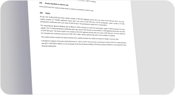Notes to the Consolidated Financial Statements (18) Cash and cash equivalents Cash includes cash on hand and demand deposits. The movement in cash and cash equivalents is shown in detail in the cash flow statement. The Group has legal or economic restrictions on CHF 5.8 million (2017: CHF 7.4 million). (19) Assets classified as held for sale At the 2018 and 2017 balance sheet dates no assets are classified as held for sale. (20) Equity As per year ending 2018 the share capital consists of 253,440 registered shares with a par value of CHF 500 each (2017: the share capital consists of 176,000 registered shares with a par value of CHF 500 each and the participation capital consists of 774,400 participation certificates with a par value of CHF 50 each. The participation capital has no voting rights). The extraordinary General Meeting held at March 6, 2018 resolved to convert the participation capital of Hilti Corporation into share capital. The 774,400 participation certificates with a par value of CHF 50 each are converted to 77,440 registered shares with a par value of CHF 500 each. The share capital now consists of 253,440 registered shares with a par value of CHF 500 each. The total capital has not changed and continues to amount to CHF 126.7 million. All the capital is fully paid in and is entitled to dividends. The capital reserve contains the share premium from capital increases and capital accruing from merges in previous years. A dividend in respect of the year ended December 31, 2018, of CHF 1,075 per share, amounting to a total of CHF 272.4 million (financial year 2017: CHF 263.6 million), is to be proposed at the Annual General Meeting. This future proposed dividend is not recognized in these financial statements. 2018 Financial Report | 54