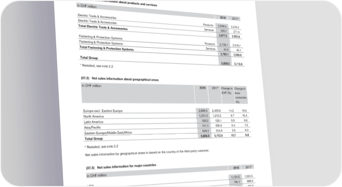 Notes to the Consolidated Financial Statements (37) Segment information In accordance with IFRS 8 Operating Segments the Group operates in only one single operating segment. Additional information concerning products, services and geographical areas is as follows: (37.1) Net sales information about products and services in CHF million 2018 2017* Electric Tools & Accessories Products 2,548.5 2,276.4 Electric Tools & Accessories Services 328.7 277.4 Total Electric Tools & Accessories 2,877.2 2,553.8 Fastening & Protection Systems Products 2,738.1 2,518.7 Fastening & Protection Systems Services 44.0 40.1 Total Fastening & Protection Systems 2,782.1 2,558.8 Total Group 5,659.3 5,112.6 * Restated, see note 2.2 (37.2) Net sales information about geographical areas in CHF million 2018 2017* Change in Change in CHF (%) local currencies (%) Europe excl. Eastern Europe 2,808.5 2,459.8 14.2 10.6 North America 1,331.3 1,213.2 9.7 10.4 Latin America 129.3 128.1 0.9 8.6 Asia/Pacific 741.1 696.6 6.4 7.0 Eastern Europe/Middle East/Africa 649.1 614.9 5.6 9.3 Total Group 5,659.3 5,112.6 10.7 9.8 * Restated, see note 2.2 Net sales information by geographical areas is based on the country of the third-party customer. Net sales information for major countries (37.3) in CHF million 2018 2017* USA 1,124.6 1,024.5 Germany 794.1 688.9 France 453.3 400.8 Liechtenstein (country of domicile) 81.9 72.9 Other countries 3,205.4 2,925.5 Total Group 5,659.3 5,112.6 * Restated, see note 2.2 Net sales by major countries are based on the country of domicile of the respective Group companies. The Group has no customer exceeding the threshold of 10% of the Group’s net sales. 2018 Financial Report | 68