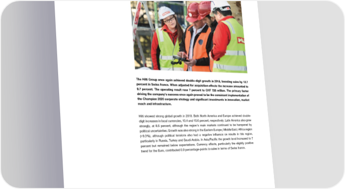 Management Report ACCELERATED SALES GROWTH AND RENEWED RISE IN PROFITABILITY Management Report digit growth in 2018, boosting sales by 10.7 The Hilti Group once again achieved double- percent in Swiss francs. When adjusted for acquisition effects the increase amounted to 9.7 percent. The operating result rose 7 percent to CHF 728 million. The primary factor driving the company’s success once again proved to be the consistent implementation of the Champion 2020 corporate strategy and significant investments in innovation, market reach and infrastructure. Hilti showed strong global growth in 2018. Both North America and Europe achieved double- digit increases in local currencies, 10.4 and 10.6 percent, respectively. Latin America also grew strongly, at 8.6 percent, although the region’s main markets continued to be hampered by political uncertainties. Growth was also strong in the Eastern Europe / Middle East / Africa region (+9.3%), although political tensions also had a negative influence on results in this region, particularly in Russia, Turkey and Saudi Arabia. In Asia/Pacific the growth level increased to 7 percent but remained below expectations. Currency effects, particularly the slightly positive trend for the Euro, contributed 0.9 percentage-points to sales in terms of Swiss francs. 2018 Financial Report | 6