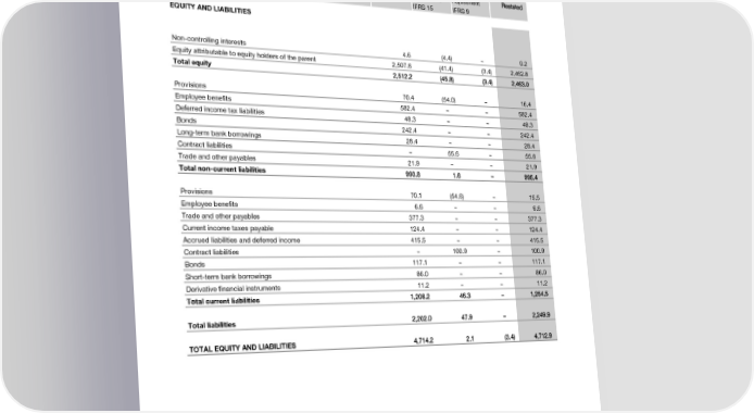 Notes to the Consolidated Financial Statements in CHF million Reported Adjustment Adjustment Restated IFRS 15 IFRS 9 EQUITY AND LIABILITIES Non-controlling interests 4.6 (4.4) – 0.2 Equity attributable to equity holders of the parent 2,507.6 (41.4) (3.4) 2,462.8 Total equity 2,512.2 (45.8) (3.4) 2,463.0 Provisions 70.4 (54.0) – 16.4 Employee benefits 582.4 – – 582.4 Deferred income tax liabilities 48.3 – – 48.3 Bonds 242.4 – – 242.4 Long-term bank borrowings 28.4 – – 28.4 Contract liabilities – 55.6 – 55.6 Trade and other payables 21.9 – – 21.9 Total non-current liabilities 993.8 1.6 – 995.4 Provisions 70.1 (54.6) – 15.5 Employee benefits 6.6 – – 6.6 Trade and other payables 377.3 – – 377.3 Current income taxes payable 124.4 – – 124.4 Accrued liabilities and deferred income 415.5 – – 415.5 Contract liabilities – 100.9 – 100.9 Bonds 117.1 – – 117.1 Short-term bank borrowings 86.0 – – 86.0 Derivative financial instruments 11.2 – – 11.2 Total current liabilities 1,208.2 46.3 – 1,254.5 Total liabilities 2,202.0 47.9 – 2,249.9 TOTAL EQUITY AND LIABILITIES 4,714.2 2.1 (3.4) 4,712.9 2018 Financial Report | 19