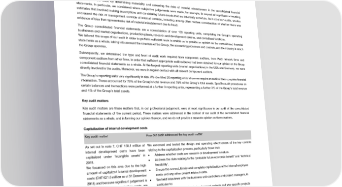 Auditors’ Report on the Consolidated Financial Statements Rationale for the materiality We chose profit before tax because, this is the most commonly used performance measure benchmark applied for the industry in which the Group operates and it is a generally accepted benchmark. Audit scope We designed our audit by determining materiality and assessing the risks of material misstatement in the consolidated financial statements. In particular, we considered where subjective judgements were made; for example, in respect of significant accounting estimates that involved making assumptions and considering future events that are inherently uncertain. As in all of our audits, we also addressed the risk of management override of internal controls, including among other matters consideration of whether there was evidence of bias that represented a risk of material misstatement due to fraud. The Group consolidated financial statements are a consolidation of over 100 reporting units, comprising the Group’s operating businesses and market organisations, production plants, research and development centres, and centralised functions. We tailored the scope of our audit in order to perform sufficient work to enable us to provide an opinion on the consolidated financial statements as a whole, taking into account the structure of the Group, the accounting processes and controls, and the industry in which the Group operates. Subsequently, we determined the type and level of audit work required from component auditors, from PwC network firms and component auditors from other firms, in order that sufficient appropriate audit evidence had been obtained for our opinion on the Group consolidated financial statements as a whole. At the largest reporting units (market organisations) in the USA and Germany, we were directly involved in the audits. Moreover, we were in regular contact with all relevant component auditors. The Group’s reporting units vary significantly in size. We identified 20 reporting units where we require an audit of their complete financial information. These accounted for 78% of the Group’s total revenue and 75% of the Group’s total assets. Specific audit procedures on certain balances and transactions were performed at a further 3 reporting units, representing a further 3% of the Group’s total revenue and 4% of the Group’s total assets. Key audit matters Key audit matters are those matters that, in our professional judgement, were of most significance in our audit of the consolidated financial statements of the current period. These matters were addressed in the context of our audit of the consolidated financial statements as a whole, and in forming our opinion thereon, and we do not provide a separate opinion on these matters. Capitalization of internal development costs Key audit matter How our audit addressed the key audit matter As set out in note 7, CHF 158.1 million of We assessed and tested the design and operating effectiveness of the key controls internal development costs have been relating to the capitalization process, particularly those that: capitalized under ‘Intangible assets’ in • Address whether costs are research or development in nature. 2018. • Address the risks relating to the ‘probable future economic benefit’ and ‘technical We focussed on this area due to the high feasibility’. amount of capitalized internal development • Ensure the correct, timely and complete capitalization of the internal employee costs (CHF 621.6 million as of 31 December costs and any other project-related costs. 2018) and because significant judgement is • We held interviews with the business unit controllers and project managers, in involved in assessing whether costs are particular to: research or development in nature and • Gain an understanding of their development projects and why specific projects whether the criteria set out in the accounting were considered to meet the requirements of the relevant accounting standards. standards (as per IAS38) for the • Discuss specific project topics and risks and critically assess the responses. capitalization of such costs have been met, Our work also included substantive audit procedures (e.g. reading the project particularly: documentation, evaluating the project’s key assumptions, testing a sample of standard • Generation of probable future hourly rates). economic benefit; Overall, we could confirm that the capitalized costs meet the capitalization criteria set out • Reliable measure of the attributable in the accounting standards and we identified no significant findings in relation to this expenditure; and matter • Technical feasibility of the project. 2018 Financial Report | 76