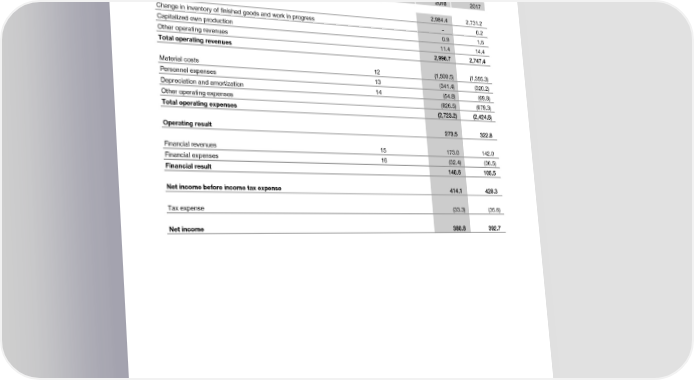 Financial Statements Hilti Corporation INCOME STATEMENT in CHF million Note 2018 2017 Net sales 2,984.4 2,731.2 Change in inventory of finished goods and work in progress – 0.2 Capitalized own production 0.9 1.6 Other operating revenues 11.4 14.4 Total operating revenues 2,996.7 2,747.4 Material costs 12 (1,500.5) (1,355.3) Personnel expenses 13 (341.4) (320.2) Depreciation and amortization 14 (54.8) (69.8) Other operating expenses (826.5) (679.3) Total operating expenses (2,723.2) (2,424.6) Operating result 273.5 322.8 Financial revenues 15 173.0 142.0 Financial expenses 16 (32.4) (36.5) Financial result 140.6 105.5 Net income before income tax expense 414.1 428.3 Tax expense (33.3) (35.6) Net income 380.8 392.7 2018 Financial Report | 82