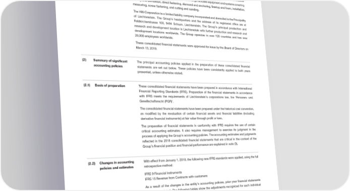 Notes to the Consolidated Financial Statements otes to the Consolidated Financial Statements (1) General information (2) Summary of significant accounting policies (1) General information The Hilti Group (the Group) comprises the Hilti Corporation and its domestic and foreign subsidiaries. The Group supplies the worldwide construction industry with technologically leading products, systems and services that provide construction professionals with innovative solutions and superior added value. Its product range includes equipment and systems covering drilling and demolition, direct fastening, diamond and anchoring, firestop and foam, installation, measuring, screw fastening, and cutting and sanding. The Hilti Corporation is a limited liability company incorporated and domiciled in the Principality of Liechtenstein. The Group’s headquarters and the address of its registered office are at Feldkircherstrasse 100, 9494 Schaan, Liechtenstein. The Group’s principal production and research and development location is Liechtenstein with further production and research and development locations worldwide. The Group operates in over 120 countries and has over 29,000 employees worldwide. These consolidated financial statements were approved for issue by the Board of Directors on March 13, 2019. (2) Summary of significant The principal accounting policies applied in the preparation of these consolidated financial accounting policies statements are set out below. These policies have been consistently applied to both years presented, unless otherwise stated. (2.1) Basis of preparation These consolidated financial statements have been prepared in accordance with International Financial Reporting Standards (IFRS). Preparation of the financial statements in accordance with IFRS meets the requirements of Liechtenstein’s corporations law, the ‘Personen- und Gesellschaftsrecht (PGR)’. The consolidated financial statements have been prepared under the historical cost convention, as modified by the revaluation of certain financial assets and financial liabilities (including derivative financial instruments) at fair value through profit or loss. The preparation of financial statements in conformity with IFRS requires the use of certain critical accounting estimates. It also requires management to exercise its judgment in the process of applying the Group’s accounting policies. The accounting estimates and judgments reflected in the 2018 consolidated financial statements that are critical in the context of the Group’s financial position and financial performance are explained in note (3). (2.2) Changes in accounting With effect from January 1, 2018, the following new IFRS standards were applied, using the full policies and estimates retrospective method: IFRS 9 Financial Instruments IFRS 15 Revenue from Contracts with customers year financial statements As a result of the changes in the entity’s accounting policies, prior- had to be restated. The following tables show the adjustments recognized for each individual line item. The adjustments are explained in more detail by standard below. Adoption of IFRS 9 Financial Instruments On January 1, 2018 (the date of initial application of IFRS 9), the Group’s management has assessed which business models apply to the financial assets held by the Group and has classified its financial instruments into the appropriate IFRS 9 categories. The impacts of IFRS 9 on the Groups financial statements are as follows: 2018 Financial Report | 16