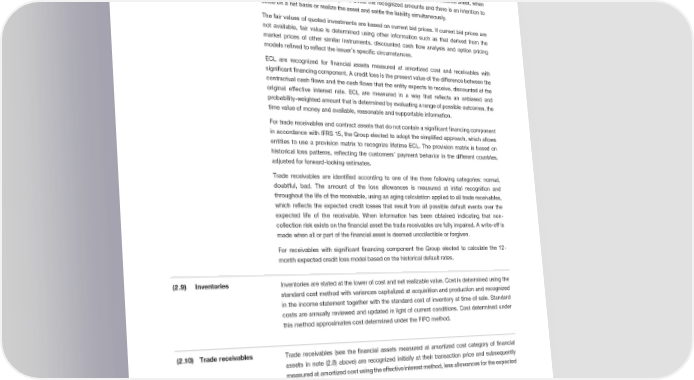 Notes to the Consolidated Financial Statements unrealized gains and losses arising from changes in the fair value recognized in the income statement in the period they arise. Financial assets and liabilities are offset and the net amount reported in the balance sheet, when there is a legally enforceable right to offset the recognized amounts and there is an intention to settle on a net basis or realize the asset and settle the liability simultaneously. The fair values of quoted investments are based on current bid prices. If current bid prices are not available, fair value is determined using other information such as that derived from the market prices of other similar instruments, discounted cash flow analysis and option pricing models refined to reflect the issuer’s specific circumstances. ECL are recognized for financial assets measured at amortized cost and receivables with significant financing component. A credit loss is the present value of the difference between the contractual cash flows and the cash flows that the entity expects to receive, discounted at the original effective interest rate. ECL are measured in a way that reflects an unbiased and probability-weighted amount that is determined by evaluating a range of possible outcomes, the time value of money and available, reasonable and supportable information. For trade receivables and contract assets that do not contain a significant financing component in accordance with IFRS 15, the Group elected to adopt the simplified approach, which allows entities to use a provision matrix to recognize lifetime ECL. The provision matrix is based on historical loss patterns, reflecting the customers’ payment behavior in the different countries, adjusted for forward-looking estimates. Trade receivables are identified according to one of the three following categories: normal, doubtful, bad. The amount of the loss allowances is measured at initial recognition and throughout the life of the receivable, using an aging calculation applied to all trade receivables, which reflects the expected credit losses that result from all possible default events over the expected life of the receivable. When information has been obtained indicating that non- off is collection risk exists on the financial asset the trade receivables are fully impaired. A write- made when all or part of the financial asset is deemed uncollectible or forgiven. For receivables with significant financing component the Group elected to calculate the 12- month expected credit loss model based on the historical default rates. Inventories Inventories are stated at the lower of cost and net realizable value. Cost is determined using the (2.9) standard cost method with variances capitalized at acquisition and production and recognized in the income statement together with the standard cost of inventory at time of sale. Standard costs are annually reviewed and updated in light of current conditions. Cost determined under this method approximates cost determined under the FIFO method. (2.10) Trade receivables Trade receivables (see the financial assets measured at amortized cost category of financial assets in note (2.8) above) are recognized initially at their transaction price and subsequently measured at amortized cost using the effective interest method, less allowances for the expected credit losses. (2.11) Cash and cash equivalents Cash and cash equivalents include cash in hand, deposits held at call with banks and other short-term highly liquid investments with original maturities of three months or less. (2.12) Borrowings Borrowings are recognized initially at fair value net of transaction costs incurred. Borrowings are subsequently measured at amortized cost with any difference between the amount at initial 2018 Financial Report | 30