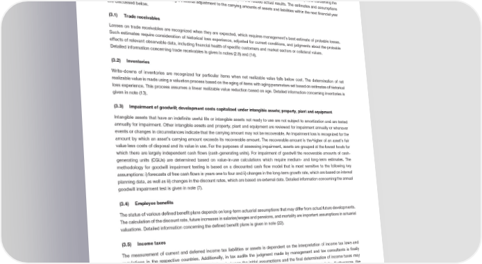 Notes to the Consolidated Financial Statements Critical accounting estimates and judgments (3) Estimates and judgments are continually evaluated and are based on historical experience and other factors, including expectations of future events that are believed to be reasonable under the circumstances. The Group makes estimates and assumptions concerning the future. The resulting accounting estimates will, by definition, seldom equal the related actual results. The estimates and assumptions that have a significant risk of causing a material adjustment to the carrying amounts of assets and liabilities within the next financial year are discussed below. (3.1) Trade receivables Losses on trade receivables are recognized when they are expected, which requires management’s best estimate of probable losses. Such estimates require consideration of historical loss experience, adjusted for current conditions, and judgments about the probable effects of relevant observable data, including financial health of specific customers and market sectors or collateral values. Detailed information concerning trade receivables is given in notes (2.8) and (14). (3.2) Inventories Write-downs of inventories are recognized for particular items when net realizable value falls below cost. The determination of net realizable value is made using a valuation process based on the aging of items with aging parameters set based on estimates of historical loss experience. This process assumes a linear realizable value reduction based on age. Detailed information concerning inventories is given in note (13). (3.3) Impairment of goodwill; development costs capitalized under intangible assets; property, plant and equipment Intangible assets that have an indefinite useful life or intangible assets not ready to use are not subject to amortization and are tested annually for impairment. Other intangible assets and property, plant and equipment are reviewed for impairment annually or whenever events or changes in circumstances indicate that the carrying amount may not be recoverable. An impairment loss is recognized for the amount by which an asset’s carrying amount exceeds its recoverable amount. The recoverable amount is the higher of an asset’s fair value less costs of disposal and its value in use. For the purposes of assessing impairment, assets are grouped at the lowest levels for which there are largely independent cash flows (cash-generating units). For impairment of goodwill the recoverable amounts of cash- generating units (CGUs) are determined based on value-in-use calculations which require medium- and long-term estimates. The methodology for goodwill impairment testing is based on a discounted cash flow model that is most sensitive to the following key assumptions: i) forecasts of free cash flows in years one to four and ii) changes in the long-term growth rate, which are based on internal planning data, as well as iii) changes in the discount rates, which are based on external data. Detailed information concerning the annual goodwill impairment test is given in note (7). (3.4) Employee benefits The status of various defined benefit plans depends on long-term actuarial assumptions that may differ from actual future developments. The calculation of the discount rate, future increases in salaries/wages and pensions, and mortality are important assumptions in actuarial valuations. Detailed information concerning the defined benefit plans is given in note (22). Income taxes (3.5) The measurement of current and deferred income tax liabilities or assets is dependent on the interpretation of income tax laws and regulations in the respective countries. Additionally, in tax audits the judgment made by management and tax consultants is finally checked and adapted. As a consequence deviations between the initial assumptions and the final determination of income taxes may lead to material changes to current or deferred income tax expense of the period in which income tax is definite. Furthermore, the recognition of deferred tax assets on tax loss carryforwards depends on the probability of future taxable profits of Group companies. Several internal and external factors are used in the estimation of such future profits. Detailed information concerning income taxes is given in notes (11) and (36). 2018 Financial Report | 39