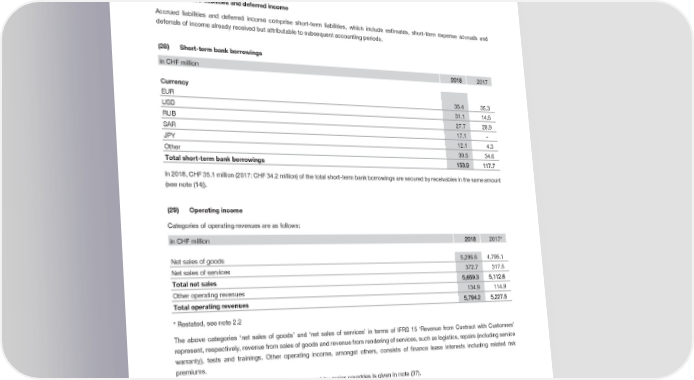 Notes to the Consolidated Financial Statements (26) Current income taxes payable and receivable Current income taxes payable and receivable consist of income taxes payable and refundable relating to the current or prior years. Details concerning deferred income tax liabilities and assets are shown in note (11). (27) Accrued liabilities and deferred income Accrued liabilities and deferred income comprise short-term liabilities, which include estimates, short-term expense accruals and deferrals of income already received but attributable to subsequent accounting periods. Short-term bank borrowings (28) in CHF million 2018 2017 Currency EUR 35.4 35.3 USD 31.1 14.6 RUB 27.7 28.9 SAR 17.1 – JPY 12.1 4.3 Other 30.5 34.6 Total short-term bank borrowings 153.9 117.7 In 2018, CHF 35.1 million (2017: CHF 34.2 million) of the total short-term bank borrowings are secured by receivables in the same amount (see note (14)). Operating income (29) Categories of operating revenues are as follows: in CHF million 2018 2017* Net sales of goods 5,286.6 4,795.1 Net sales of services 372.7 317.5 Total net sales 5,659.3 5,112.6 Other operating revenues 134.9 114.9 Total operating revenues 5,794.2 5,227.5 * Restated, see note 2.2 The above categories ‘net sales of goods’ and ‘net sales of services’ in terms of IFRS 15 ‘Revenue from Contract with Customers’ represent, respectively, revenue from sales of goods and revenue from rendering of services, such as logistics, repairs (including service warranty), tests and trainings. Other operating income, amongst others, consists of finance lease interests including related risk premiums. A breakdown of net sales by geographical areas and by major countries is given in note (37). 2018 Financial Report | 64