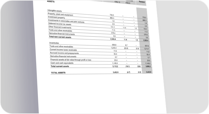 Notes to the Consolidated Financial Statements CONSOLIDATED BALANCE SHEET AS AT DECEMBER 31, 2017 in CHF million Reported Adjustment Adjustment Restated IFRS 15 IFRS 9 ASSETS Intangible assets 732.0 – – 732.0 Property, plant and equipment 866.3 – – 866.3 Investment property 1.9 – – 1.9 Investments in associates and joint ventures 2.6 – – 2.6 Deferred income tax assets 141.1 11.4 1.6 154.1 Other financial investments 11.5 – – 11.5 Trade and other receivables 579.4 – – 579.4 Derivative financial instruments 5.6 – – 5.6 Total non-current assets 2,340.4 11.4 1.6 2,353.4 Inventories 630.9 6.7 – 637.6 Trade and other receivables 1,243.4 (22.8) (5.9) 1,214.7 Current income taxes receivable 11.6 – – 11.6 Accrued income and prepayments 55.4 – – 55.4 Derivative financial instruments 5.7 – – 5.7 Financial assets at fair value through profit or loss 25.0 – – 25.0 Cash and cash equivalents 1,140.2 – – 1,140.2 Total current assets 3,112.2 (16.1) (5.9) 3,090.2 TOTAL ASSETS 5,452.6 (4.7) (4.3) 5,443.6 2018 Financial Report | 20