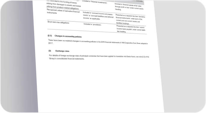Notes to the Financial Statements Hilti Corporation The following table identifies the significant presentation differences relating to items in the financial statements of Hilti Corporation and the corresponding items in the Group’s consolidated financial statements. Relevant financial statement item Presentation in financial statements of Presentation in Group financial statements Hilti Corporation Investments in deposits, bonds and equi- Included in ‘financial investments’. Included in ‘financial assets at fair value ties restricted to the funding of losses through profit or loss’ under current assets arising from damages to assets and losses heading. arising from product-related obligations Recognized values of derivative financial Included in ‘accrued income and prepay- Presented as a separate line item ‘derivative instruments ments’ or ‘accrued liabilities and deferred financial instruments’ under each of the income’ as applicable. current and non-current assets and liabilities headings. Short-term tax obligations Included in ‘provisions’. Presented as a separate line item ‘current income taxes payable’ under current liabili- ties heading. Changes in accounting policies (2.3) There have been no material changes in accounting policies in the 2018 financial statements of Hilti Corporation from those adopted in 2017. (3) Exchange rates For details of foreign exchange rates of principal currencies that have been applied for translation into Swiss francs, see note (2.5) of the Group’s consolidated financial statements. 2018 Financial Report | 84