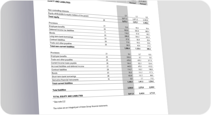 Group Financial Statements in CHF million Note 31.12.2018 31.12.2017 01.01.2017 Restated* Restated* EQUITY AND LIABILITIES Non-controlling interests 3.7 1.5 0.2 Equity attributable to equity holders of the parent 3,071.4 2,871.2 2,462.8 Total equity 20 3,075.1 2,872.7 2,463.0 Provisions 21 13.6 16.5 16.4 Employee benefits 22 522.8 550.9 582.4 Deferred income tax liabilities 11 116.0 91.9 48.3 Bonds 23 299.9 334.4 242.4 Long-term bank borrowings 24 27.6 30.9 28.4 Contract liabilities 29 71.6 64.2 55.6 Trade and other payables 25 36.9 40.6 21.9 Total non-current liabilities 1,088.4 1,129.4 995.4 Provisions 21 9.4 8.7 15.5 Employee benefits 22 105.6 8.7 6.6 Trade and other payables 25 479.0 479.1 377.3 Current income taxes payable 26 104.1 122.1 124.4 Accrued liabilities and deferred income 27 445.5 470.1 415.5 Contract liabilities 29 114.7 115.7 100.9 Bonds 23 33.2 111.7 117.1 Short-term bank borrowings 28 153.9 117.7 86.0 Derivative financial instruments 16 3.0 7.7 11.2 Total current liabilities 1,448.4 1,441.5 1,254.5 Total liabilities 2,536.8 2,570.9 2,249.9 TOTAL EQUITY AND LIABILITIES 5,611.9 5,443.6 4,712.9 * See note 2.2 The notes are an integral part of these Group financial statements. 2018 Financial Report | 11