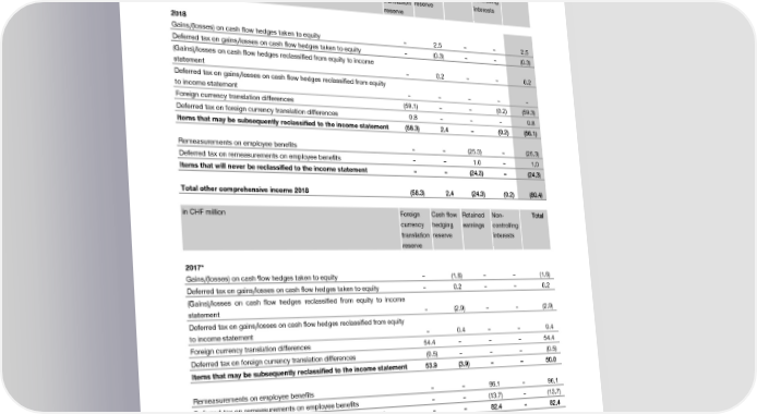 Notes to the Consolidated Financial Statements The disaggregation of changes of OCI by each type of reserve in equity is shown below: in CHF million Foreign Cash flow Retained Non- Total currency hedging earnings controlling translation reserve interests reserve 2018 Gains/(losses) on cash flow hedges taken to equity – 2.5 – – 2.5 Deferred tax on gains/losses on cash flow hedges taken to equity – (0.3) – – (0.3) (Gains)/losses on cash flow hedges reclassified from equity to income statement – 0.2 – – 0.2 Deferred tax on gains/losses on cash flow hedges reclassified from equity to income statement – – – – – Foreign currency translation differences (59.1) – – (0.2) (59.3) Deferred tax on foreign currency translation differences 0.8 – – – 0.8 Items that may be subsequently reclassified to the income statement (58.3) 2.4 – (0.2) (56.1) Remeasurements on employee benefits – – (25.3) – (25.3) Deferred tax on remeasurements on employee benefits – – 1.0 – 1.0 Items that will never be reclassified to the income statement – – (24.3) – (24.3) Total other comprehensive income 2018 (58.3) 2.4 (24.3) (0.2) (80.4) in CHF million Foreign Cash flow Retained Non- Total currency hedging earnings controlling translation reserve interests reserve 2017* Gains/(losses) on cash flow hedges taken to equity – (1.6) – – (1.6) Deferred tax on gains/losses on cash flow hedges taken to equity – 0.2 – – 0.2 (Gains)/losses on cash flow hedges reclassified from equity to income statement – (2.9) – – (2.9) Deferred tax on gains/losses on cash flow hedges reclassified from equity to income statement – 0.4 – – 0.4 Foreign currency translation differences 54.4 – – – 54.4 Deferred tax on foreign currency translation differences (0.5) – – – (0.5) Items that may be subsequently reclassified to the income statement 53.9 (3.9) – – 50.0 Remeasurements on employee benefits – – 96.1 – 96.1 Deferred tax on remeasurements on employee benefits – – (13.7) – (13.7) Items that will never be reclassified to the income statement – – 82.4 – 82.4 Total other comprehensive income 2017* 53.9 (3.9) 82.4 – 132.4 * Restated, see note 2.2 2018 Financial Report | 55