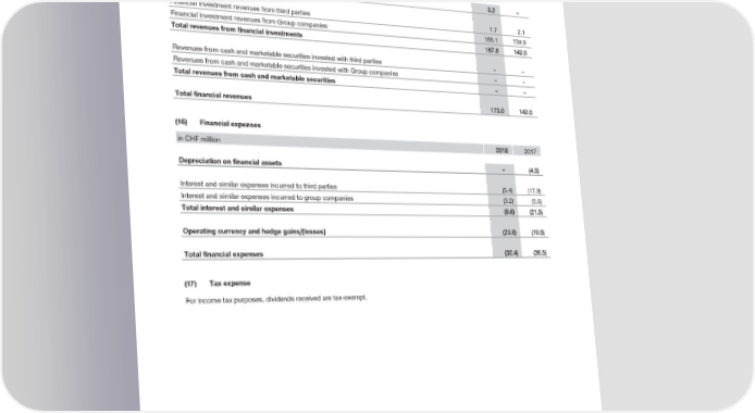 Notes to the Financial Statements Hilti Corporation (15) Financial revenues in CHF million 2018 2017 Recovery of depreciation on financial assets 5.2 – Financial investment revenues from third parties 1.7 2.1 Financial investment revenues from Group companies 166.1 139.9 Total revenues from financial investments 167.8 142.0 Revenues from cash and marketable securities invested with third parties – – Revenues from cash and marketable securities invested with Group companies – – Total revenues from cash and marketable securities – – Total financial revenues 173.0 142.0 (16) Financial expenses in CHF million 2018 2017 Depreciation on financial assets – (4.5) Interest and similar expenses incurred to third parties (5.4) (17.9) Interest and similar expenses incurred to group companies (3.2) (3.6) Total interest and similar expenses (8.6) (21.5) Operating currency and hedge gains/(losses) (23.8) (10.5) Total financial expenses (32.4) (36.5) (17) Tax expense For income tax purposes, dividends received are tax-exempt. 2018 Financial Report | 89