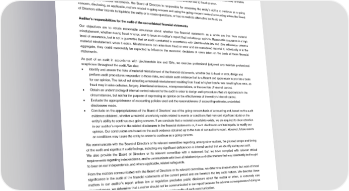 Auditors’ Report on the Financial Statements Hilti Corporation Responsibilities of the Board of Directors for the financial statements The Board of Directors is responsible for the preparation of the financial statements in accordance with the provisions of Liechtenstein law and the company’s articles of incorporation, and for such internal control as the Board of Directors determines is necessary to enable the preparation of financial statements that are free from material misstatement, whether due to fraud or error. In preparing the financial statements, the Board of Directors is responsible for assessing the entity’s ability to continue as a going concern, disclosing, as applicable, matters related to going concern and using the going concern basis of accounting unless the Board of Directors either intends to liquidate the entity or to cease operations, or has no realistic alternative but to do so. Auditor’s responsibilities for the audit of the consolidated financial statements Our objectives are to obtain reasonable assurance about whether the financial statements as a whole are free from material misstatement, whether due to fraud or error, and to issue an auditor’s report that includes our opinion. Reasonable assurance is a high level of assurance, but is not a guarantee that an audit conducted in accordance with Liechtenstein law and ISAs will always detect a material misstatement when it exists. Misstatements can arise from fraud or error and are considered material if, individually or in the aggregate, they could reasonably be expected to influence the economic decisions of users taken on the basis of these financial statements. As part of an audit in accordance with Liechtenstein law and ISAs, we exercise professional judgment and maintain professional scepticism throughout the audit. We also: • Identify and assess the risks of material misstatement of the financial statements, whether due to fraud or error, design and perform audit procedures responsive to those risks, and obtain audit evidence that is sufficient and appropriate to provide a basis for our opinion. The risk of not detecting a material misstatement resulting from fraud is higher than for one resulting from error, as fraud may involve collusion, forgery, intentional omissions, misrepresentations, or the override of internal control. • Obtain an understanding of internal control relevant to the audit in order to design audit procedures that are appropriate in the circumstances, but not for the purpose of expressing an opinion on the effectiveness of the entity’s internal control. • Evaluate the appropriateness of accounting policies used and the reasonableness of accounting estimates and related disclosures made. • Conclude on the appropriateness of the Board of Directors’ use of the going concern basis of accounting and, based on the audit evidence obtained, whether a material uncertainty exists related to events or conditions that may cast significant doubt on the entity’s ability to continue as a going concern. If we conclude that a material uncertainty exists, we are required to draw attention in our auditor’s report to the related disclosures in the financial statements or, if such disclosures are inadequate, to modify our opinion. Our conclusions are based on the audit evidence obtained up to the date of our auditor’s report. However, future events or conditions may cause the entity to cease to continue as a going concern. We communicate with the Board of Directors or its relevant committee regarding, among other matters, the planned scope and timing of the audit and significant audit findings, including any significant deficiencies in internal control that we identify during our audit. We also provide the Board of Directors or its relevant committee with a statement that we have complied with relevant ethical requirements regarding independence, and to communicate with them all relationships and other matters that may reasonably be thought to bear on our independence, and where applicable, related safeguards. From the matters communicated with the Board of Directors or its relevant committee, we determine those matters that were of most significance in the audit of the financial statements of the current period and are therefore the key audit matters. We describe these matters in our auditor’s report unless law or regulation precludes public disclosure about the matter or when, in extremely rare circumstances, we determine that a matter should not be communicated in our report because the adverse consequences of doing so would reasonably be expected to outweigh the public interest benefits of such communication. 2018 Financial Report | 93