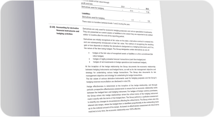 Notes to the Consolidated Financial Statements in CHF million Level 1 Level 2 Level 3 Total At December 31, 2017 Assets Financial assets at fair value through profit and loss 25.0 – – 25.0 Derivatives used for hedging – 11.3 – 11.3 Liabilities Derivatives used for hedging – 7.7 – 7.7 There were no transfers between levels 1 and 2 during the year. (2.22 ) Accounting for derivative Derivatives are only used for economic hedging purposes and not as speculative investments. financial instruments and They are presented as current assets or liabilities to the extent they are expected to be settled hedging activities within 12 months after the end of the reporting period. Derivatives are initially recognized at fair value on the date a derivative contract is entered into and are subsequently remeasured at their fair value. The method of recognizing the resulting gain or loss depends on whether the derivative is designated as a hedging instrument, and if so, the nature of the item being hedged. The Group designates certain derivatives as one of: • hedges of the fair value of recognized assets or liabilities or a firm commitment (fair value hedges) • hedges of highly probable forecast transactions (cash flow hedges) and • hedges of net investments in foreign operations (net investment hedges). At the inception of the hedge relationship the Group documents the economic relationship between hedging instruments and hedged items, as well as its risk management objective and strategy for undertaking various hedge transactions. The Group also documents its risk management objective and strategy for undertaking its hedge transactions. The fair values of various derivative instruments used for hedging purposes and the Group’s hedging reserves reconciliation are disclosed in note (16). Hedge effectiveness is determined at the inception of the hedge relationship, and through periodic prospective effectiveness assessments to ensure that an economic relationship exists between the hedged item and hedging instrument. For hedges of foreign currency purchases, the Group enters into hedge relationships where the critical terms of the hedging instrument match exactly with the terms of the hedged item. The Group performs a qualitative assessment to identify any changes in circumstances affecting the critical terms. The Group enters also into interest rate swaps, where the hedged item is identified proportionally to the outstanding loans up to the notional amount of the swaps. As based on effectiveness assessment all critical terms matched at any time, the economic relationship was 100% effective. 2018 Financial Report | 38