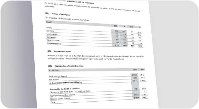 Notes to the Financial Statements Hilti Corporation Remuneration of the Board of Directors and the Corporate Management (22) For details of the remuneration of the Board of Directors and the Corporate Management, see note (42) of the Group’s consolidated financial statements. Other transactions and balances with the shareholder (23) For details about other transactions and balances with the shareholder see note (42.3) within the notes to the consolidated financial statements. Number of employees (24) The breakdown of employees by nationality is as follows: Country 2018 % 2017 % Austria 868 40% 831 40% Germany 414 19% 408 20% Liechtenstein 153 7% 159 8% Switzerland 229 11% 225 11% Other countries 513 23% 452 21% Total employees 2,177 100% 2,075 100% Management report (25) Pursuant to Article 1121 (3) of the PGR, the management report of Hilti Corporation has been combined with the consolidated management report. The consolidated management report is on pages 6 and 7 of this Financial Report. (26) Appropriation of retained earnings in CHF million 2018 2017 Profit brought forward 2,076.6 1,947.5 Net income 380.8 392.7 At the disposal of the General Meeting 2,457.4 2,340.2 Proposal by the Board of Directors Dividend of CHF 1075 (2017: CHF 1040) per share 272.4 263.6 Appropriation to other reserves – – Balance carried forward 2,185.0 2,076.6 Total 2,457.4 2,340.2 2018 Financial Report | 91
