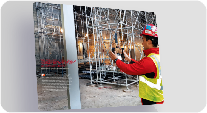 2019 Hilti Company Report “ FIELD2BIM SOLUTIONS GREATLY ENHANCE THE PRODUCTIVITY OF OUR CUSTOMERS.” Thomas Hillbrand, Head of the Measuring Business Unit, Hilti Headquarters, Liechtenstein This image shows Hilti Project Manager Ashvin Kumar with four of his colleagues – of course, they cannot actually be seen with Ashvin on the construction site in Toronto, Canada, because they are touring the site with him virtually from their workplaces in the USA, Asia and Europe. The images that Ashvin scans are processed into a 3D digital walk-through of the project. This technology, purchased by Hilti in 2019 from the start-up company Indoor Reality Inc., allows Ashvin’s customer to precisely plan the project’s next steps together with an international team of experts. This is made possible using cloud-based 3D visualization, which creates a technological bridge between the physical and digital worlds. 44–45