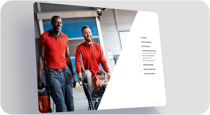 2019 Hilti Company Report 02 EDITORIAL 04 COMPANY PROFILE 08 CEO INTERVIEW 10 CHAMPION 2020 STRATEGY 12 Product and Service Differentiation 24 Direct Customer Relationship 38 Operational Excellence 50 High-performing Global Team 62 EXECUTIVE BOARD 64 BOARD OF DIRECTORS 68 FINANCIAL FIGURES 01