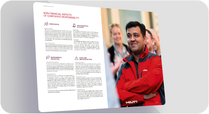 2019 Hilti Company Report NON-FINANCIAL ASPECTS OF CORPORATE RESPONSIBILITY HUMAN RIGHTS ANTI-CORRUPTION ACTIVITIES Code of Conduct Organization Hilti strives to consistently improve the ethical and social The Compliance Management System (CMS) developed conditions associated with business activities and therefore over previous years was developed further in the year under mandates that its suppliers observe international require- review, notably establishing guidelines for regulating con- ments and ethical standards. The company uses audits to 昀氀icts of interest. In strategic terms, the CMS is based on the ensure that the standards are maintained. In case of serious guidelines contained in ISO 19600 and ISO 37001. violations of the Code of Conduct, such as employing child or forced labor, Hilti is authorized to immediately terminate Prevention any agreement. Hilti employees are regularly trained to observe the com- pany’s internal anti-corruption guidelines. Hilti continues Anti-discrimination to work on creating modern methods and approaches Hilti is convinced that commercial success and corporate to prevent corruption. Additionally, possible corporate responsibility are directly connected. In addition to a culture acquisitions are subject to appropriate prevention and that is based on integrity and mutual respect, globally valid inspection measures which meet the company’s high level anti-discrimination guidelines create transparency in order of compliance requirements. to ensure inclusive behavior in the workplace. ENVIRONMENTAL SOCIAL AND PROTECTION EMPLOYEE MATTERS Reducing CO2 emissions Corporate culture As part of its global CO strategy Hilti has taken various The Hilti Way describes a corporate culture characterized 2 measures from a trio of subjects that include deploying elec- by common values, exemplary management and the con- viction that corporate growth and personal development tric vehicles, greater energy ef昀椀ciency in manufacturing and purchasing greener energy. Having achieved large savings in go hand in hand. This is why Hilti invests in workshops each the previous years, the emissions per employee were further year that exclusively focus on corporate culture and that reduced by 2.7 percent. reach all employees and management levels at all locations. In 2019, some 42,000 employee workdays were spent on corporate culture workshops. Energy ef昀椀ciency Another focus topic in 2019 was the energy ef昀椀ciency in the production facilities. At Hilti’s manufacturing facility Occupational safety in Thueringen, Austria, for example, hall ventilators were Accident prevention is a central point of occupational safe- replaced by modern lamellar ventilators. In addition to sig- ty. Over the past several years, a program known as “near ni昀椀cantly reducing the amount of energy used, this measure miss management” was established in the manufacturing also improved the building’s air quality. Various measures facilities, warehouses and tool service centers as part of taken in the year under review resulted in the saving of a comprehensive lean initiative. The target is to identify several 100,000 kWh of energy solely at the company’s dangerous situations or near misses and to implement production facilities. corresponding preventive measures. Employee health You can 昀椀nd an overview of key environment-related 昀椀gures online at www.hilti.group. In 2019, Hilti once again implemented a number of mea- sures and campaigns aimed at promoting better health at various locations around the world. In addition to measures which are required legally, many local organizations also offer initiatives focusing on sport, nutrition and medical and psychological counselling. 66–67