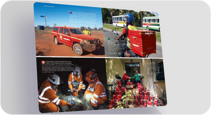 2019 Hilti Company Report When his customers in the Golden Outback need him, Hilti Account Manager Andrew Sindall gets into his red off-road vehicle. This can mean driving for up to 12 hours and 700 miles to get from Perth to the Western Australian mining regions. In Australia, having satis昀椀 ed customers requires going more than just one extra mile, but Andrew is happy to go the distance. This picture was taken on the way to a new mine on a rough unpaved road leading out of Leonora, Western Australia. They are known as “hunters” – maneuvering their motorcycles to get closer to smaller customers in Tanzania as quickly as they can, and better than anyone else. One thing that’s always along for the ride with the 22 construction site hunters: a red Hilti sales box containing basic tools and accessories. Their target is to make a spontaneous sale to one of the many of workers who largely improvise their work and applications, helping them to be more reliable in what they do. Has the shotcrete suf昀椀 ciently hardened? In Peru’s San In 2016, Mihai Ojog, the general Rafael tin mine, the response comes six hours after the manager of the Romanian shotcrete has been applied. This is no problem with Hilti technology. company Brenneka Install, signed his One simply has to let the concrete harden, set the anchor and 昀椀 rst 昀氀 eet management contract with measure its pull-out resistance. Here, Hilti Account Manager Víctor Hilti Account Manager Bogdan Frantia. Raúl Segura (right) explains to workers how they can use the data This year, he extended that contract. from the HAT 28 anchor tester to quickly and reliably determine the After all, having one’s tools available strength of the concrete. when they are needed has a positive impact on productivity – something he and his teams can’t do without. 36–37