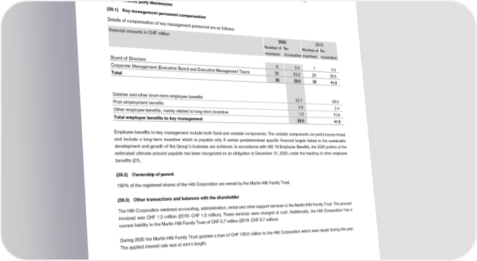 Notes to the Consolidated Financial Statements Notes to the Consolidated Financial Statements (38) Research and development expenditure (41) Group companies and joint arrangements Expenditure on research and development in the reporting period amounted to CHF 358.0 million (2019: CHF 366.6 million), thereof Country Company name and location Activity CHF 171.4 million (2019: CHF 171.5 million) were recognized as intangible assets (see development costs in note (7)). S = sales R = research (39) Related party disclosures D = development P = production (39.1) Key management personnel compensation Se = services H = holding Details of compensation of key management personnel are as follows: financial amounts in CHF million 22002200 2019 Parent company Number of Re- Number of Re- members muneration members muneration Liechtenstein Hilti Corporation, Feldkircherstrasse 100, P.O. Box 333, 9494 Schaan, S, R, D, P, Se, H Tel. +423 234 2111, www.hilti.group Board of Directors 8 3.4 7 3.3 Corporate Management (Executive Board and Executive Management Team) 30 25.2 29 38.5 100% owned consolidated Group companies (subsidiaries – including production plants and market organizations) Total 3388 2288..66 3366 4411..88 Albania Hilti Albania sh.p.k., Tirana S Algeria Hilti Construction Equipements EURL, Alger S Salaries and other short-term employee benefits 23.7 28.6 Argentina Hilti Argentina S.R.L., Buenos Aires S Post-employment benefits 3.9 2.4 Australia Hilti (Aust.) Pty. Ltd., Rhodes New South Wales S Other employee benefits, mainly related to long-term incentive 1.0 10.8 Austria Hilti Austria Gesellschaft m.b.H., Vienna S Total employee benefits to key management 2288..66 4411..88 Hilti Holding GmbH, Vienna H Hilti Aktiengesellschaft Zweigniederlassung Thüringen, Thüringen P Employee benefits to key management include both fixed and variable components. The variable components are performance-linked Eurofox GmbH, Lanzenkirchen P, D and include a long-term incentive which is payable only if certain predetermined specific financial targets linked to the sustainable Belarus Hilti BY FLLC, Minsk S development and growth of the Group’s business are achieved. In accordance with IAS 19 Employee Benefits, the 2020 portion of the Belgium Hilti Belgium N.V., Brussels S estimated ultimate amount payable has been recognized as an obligation at December 31, 2020, under the heading of other employee Bosnia-Herzegovina Hilti Systems BH d.o.o. Sarajevo, Sarajevo S benefits (21). Brazil Hilti do Brasil Comercial Ltda., São Paulo S Bulgaria Hilti (Bulgaria) EOOD, Sofia S (39.2) Ownership of parent Canada Hilti (Canada) Corporation, Mississauga, Ontario S 100% of the registered shares of the Hilti Corporation are owned by the Martin Hilti Family Trust. Chile Hilti Chile Limitada, Santiago de Chile S China Hilti (China) Ltd., Zhanjiang P, D (39.3) Other transactions and balances with the shareholder Hilti (China) Distribution Ltd., Shanghai S Hilti (PEC Suzhou) Ltd., Suzhou P The Hilti Corporation rendered accounting, administration, rental and other support services to the Martin Hilti Family Trust. The amount Hilti (Shanghai) Ltd., Shanghai P, D invoiced was CHF 1.0 million (2019: CHF 1.0 million). These services were charged at cost. Additionally, the Hilti Corporation has a current liability to the Martin Hilti Family Trust of CHF 0.7 million (2019: CHF 0.7 million). Oglaend Industries (Suzhou) Co., Ltd., Suzhou P Oglaend System (Suzhou) Trading Co., Ltd., Suzhou S During 2020 the Martin Hilti Family Trust granted a loan of CHF 100.0 million to the Hilti Corporation which was repaid during the year. Colombia Hilti Colombia S A S, Bogota D.C. S The applied interest rate was at arm’s length. Croatia Hilti Croatia d.o.o., Sesvete S Czech Republic Hilti ČR spol. s r.o., Průhonice S (40) Events after the reporting period Denmark Hilti Danmark A/S, Hvidovre S Øglænd System A/S, Haderslev S There were no significant transactions after the reporting period. Estonia Hilti Eesti OÜ, Tallinn S Finland Hilti (Suomi) OY, Vantaa S France Hilti France SAS, Boulogne-Billancourt S Hilti Digital Marketing Services SAS, Boulogne-Billancourt Se Germany Hilti Deutschland AG (Liechtenstein), Zweigniederlassung Deutschland, Kaufering S Hilti GmbH Industriegesellschaft für Befestigungstechnik, Kaufering P Hilti Entwicklungsgesellschaft mbH, Kaufering D Hilti Kunststofftechnik GmbH, Nersingen P 2020 Financial Report | 64 2020 Financial Report | 65