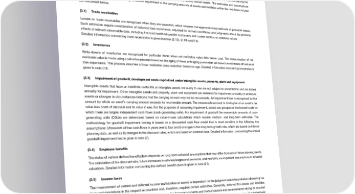 Notes to the Consolidated Financial Statements (3) Critical accounting estimates and judgments Estimates and judgments are continually evaluated and are based on historical experience and other factors, including expectations of future events that are believed to be reasonable under the circumstances. The Group makes estimates and assumptions concerning the future. The resulting accounting estimates will, by definition, seldom equal the related actual results. The estimates and assumptions that have a significant risk of causing a material adjustment to the carrying amounts of assets and liabilities within the next financial year are discussed below. (3.1) Trade receivables Losses on trade receivables are recognized when they are expected, which requires management’s best estimate of probable losses. Such estimates require consideration of historical loss experience, adjusted for current conditions, and judgments about the probable effects of relevant observable data, including financial health of specific customers and market sectors or collateral values. Detailed information concerning trade receivables is given in notes (2.12), (2.10) and (14). (3.2) Inventories Write-downs of inventories are recognized for particular items when net realizable value falls below cost. The determination of net realizable value is made using a valuation process based on the aging of items with aging parameters set based on estimates of historical loss experience. This process assumes a linear realizable value reduction based on age. Detailed information concerning inventories is given in note (13). (3.3) Impairment of goodwill; development costs capitalized under intangible assets; property, plant and equipment Intangible assets that have an indefinite useful life or intangible assets not ready to use are not subject to amortization and are tested annually for impairment. Other intangible assets and property, plant and equipment are reviewed for impairment annually or whenever events or changes in circumstances indicate that the carrying amount may not be recoverable. An impairment loss is recognized for the amount by which an asset’s carrying amount exceeds its recoverable amount. The recoverable amount is the higher of an asset’s fair value less costs of disposal and its value in use. For the purposes of assessing impairment, assets are grouped at the lowest levels for which there are largely independent cash flows (cash-generating units). For impairment of goodwill the recoverable amounts of cash- generating units (CGUs) are determined based on value-in-use calculations which require medium- and long-term estimates. The methodology for goodwill impairment testing is based on a discounted cash flow model that is most sensitive to the following key assumptions: i) forecasts of free cash flows in years one to four and ii) changes in the long-term growth rate, which are based on internal planning data, as well as iii) changes in the discount rates, which are based on external data. Detailed information concerning the annual goodwill impairment test is given in note (7). (3.4) Employee benefits The status of various defined benefit plans depends on long-term actuarial assumptions that may differ from actual future developments. The calculation of the discount rate, future increases in salaries/wages and pensions, and mortality are important assumptions in actuarial valuations. Detailed information concerning the defined benefit plans is given in note (21). (3.5) Income taxes The measurement of current and deferred income tax liabilities or assets is dependent on the judgment and interpretation of existing tax laws and regulations in the respective countries and, therefore, requires certain estimates. Generally, deferred tax assets and liabilities are determined based on temporary differences between the financial accounts and the tax balance and are measured relying on enacted tax rates and, if applicable, on tax rates that are anticipated to be in effect when differences are estimated to reverse, if substantively enacted. Unforeseen changes in these areas may affect these estimates. Additionally, in tax disputes, the judgments taken by management could be challenged by tax authorities, potentially resulting in the payment of additional taxes, interest and/or penalties. Consequently, deviations between the initial assumptions and the final determination of income taxes may lead to material changes to current or deferred income tax expenses of the period in which such income tax becomes definite. Furthermore, the recognition of deferred tax assets on tax loss carryforwards depends on the probability of future taxable profits of Group companies. Several internal and external factors, such as forecasts, interpretations of existing tax laws and regulations are used in the estimation of such future profits. Tax positions are regularly and proactively clarified with external tax experts to reduce tax contingencies. If such tax positions 2020 Financial Report | 35