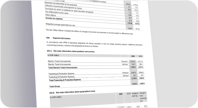 Notes to the Consolidated Financial Statements Notes to the Consolidated Financial Statements in CHF million 22002200 2019 (34.3) Net sales information for major countries Net income before income tax 665511..66 771155..88 in CHF million 22002200 2019 Tax calculated at domestic tax rates applicable to profits in the respective countries (109.4) (115.4) USA 1,100.1 1,219.8 Income not subject to tax 3.3 6.4 Germany 826.3 834.4 Expenses not deductible for tax purposes (8.5) (10.1) France 417.2 476.0 Utilization of previously unrecognized tax losses 1.2 1.5 Liechtenstein (country of domicile) 63.4 71.6 Tax losses for which no deferred tax asset has been recognized (2.8) (1.2) Other countries 2,925.2 3,298.1 Tax attributable to prior years (2.4) 0.7 Total Group 55,,333322..22 55,,889999..99 Other effects (2.3) (6.5) Net sales by major countries are based on the country of domicile of the respective Group companies. Income tax expense ((112200..99)) ((112244..66)) The Group has no customer exceeding the threshold of 10% of the Group’s net sales. Weighted average applicable tax rate 16.8% 16.1% (34.4) Selected non-current assets information for major countries* The line ‘Other effects’ includes the effects of changes in tax rates and expenses or incomes subject to different tax rates. in CHF million 22002200 2019 (34) Segment information Liechtenstein (country of domicile) 1,188.7 1,117.0 Germany 286.0 259.9 In accordance with IFRS 8 Operating Segments the Group operates in only one single operating segment. Additional information USA 148.5 164.6 concerning products, services and geographical areas is as follows: Norway 133.0 149.9 Other countries 571.1 591.7 (34.1) Net sales information about products and services Total Group 22,,332277..33 22,,228833..11 in CHF million 22002200 2019 * Excluding non-current financial assets and deferred taxes Electric Tools & Accessories Products 2,240.2 2,517.2 Electric Tools & Accessories Services 352.7 356.1 (35) Contingent liabilities Total Electric Tools & Accessories 22,,559922..99 22,,887733..33 in CHF million 22002200 2019 Fastening & Protection Systems Products 2,687.2 2,984.5 Fastening & Protection Systems Services 52.1 42.1 Guarantees 3.7 5.6 Total Fastening & Protection Systems 22,,773399..33 33,,002266..66 Other contingent liabilities 1.7 1.7 Total contingent liabilities 55..44 77..33 Total Group 55,,333322..22 55,,889999..99 Management considers the possibility of any outflow in settlement to be remote. (34.2) Net sales information about geographical areas in CHF million 22002200 2019 Change in Change in (36) Other commitments CHF (%) local currencies Capital commitments contracted for at the end of the reporting period but not yet incurred are as follows: (%) in CHF million 22002200 2019 Europe excl. Eastern Europe 2,718.2 2,900.2 (6.3) (2.7) Intangible assets – 0.1 North America 1,306.1 1,444.9 (9.6) (4.3) Property, plant and equipment 18.0 17.7 Latin America 98.7 132.0 (25.2) (8.1) Total at December 31 1188..00 1177..88 Asia/Pacific 670.2 764.8 (12.4) (7.0) Eastern Europe/Middle East/Africa 539.0 658.0 (18.1) (8.2) (37) Financial assets pledged as collateral Total Group 55,,333322..22 55,,889999..99 ((99..66)) ((44..33)) Details of receivables pledged as collateral for recognized liabilities are given in note (14). There are no other financial assets pledged as Net sales information by geographical areas is based on the country of the third-party customer. collateral for recognized liabilities or for contingent liabilities. 2020 Financial Report | 62 2020 Financial Report | 63