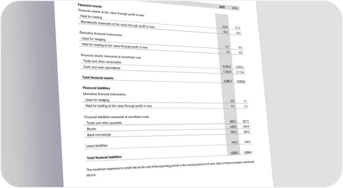Notes to the Consolidated Financial Statements (6) Financial assets and liabilities Financial assets and liabilities listed according to the measurement categories identified under IFRS 9 Financial Instruments and IFRS 16 Leases. Recognition and measurement and the corresponding balance sheet items are as follows: in CHF million 22002200 2019 Financial assets Financial assets at fair value through profit or loss Held for trading 23.8 27.3 Mandatorily measured at fair value through profit or loss 18.5 16.6 Derivative financial instruments Used for hedging 6.1 6.9 Held for trading at fair value through profit or loss 4.2 8.8 Financial assets measured at amortized cost Trade and other receivables 2,035.2 2,050.5 Cash and cash equivalents 1,332.9 1,113.8 Total financial assets 33,,442200..77 33,,222233..99 Financial liabilities Derivative financial instruments Used for hedging 2.6 1.7 Held for trading at fair value through profit or loss 4.1 1.3 Financial liabilities measured at amortized costs Trade and other payables 486.2 507.9 Bonds 449.8 299.9 Bank borrowings 186.2 280.0 Lease liabilities 444.2 448.6 Total financial liabilities 11,,557733..11 11,,553399..44 The maximum exposure to credit risk at the end of the reporting period is the carrying amount of each class of financial assets mentioned above. 2020 Financial Report | 37