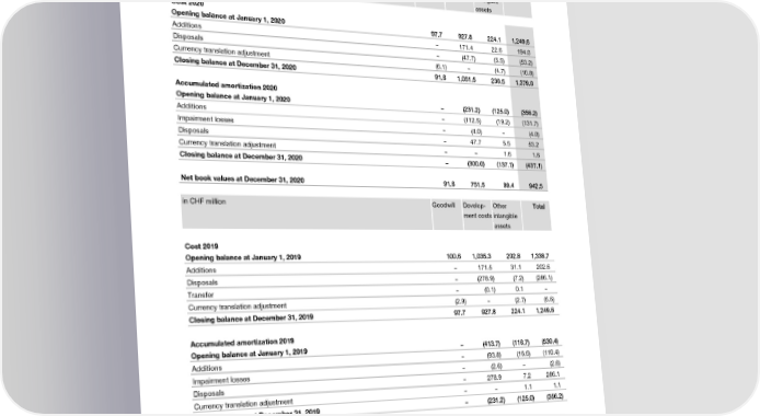 Notes to the Consolidated Financial Statements Notes to the Consolidated Financial Statements (7) Intangible assets For impairment testing purposes, goodwill is solely allocated to the Group’s offshore business as the cash-generating unit (CGU). To test for possible impairment of goodwill, the recoverable amount, calculated as discounted value of the estimated future cash flows of in CHF million Goodwill Develop- Other TToottaall the CGU (its ‘value in use’), is compared with its carrying amount. The future cash flows are estimated on the basis of the business plan ment costs intangible approved by management in general covering a four-year forecast period – 2021 to 2024 – and a constant growth rate assumption of assets 2.0% for the terminal value beyond 2024. The value in use of the CGU is based on a post-tax discount rate of 10.1%. The calculation of value in use is most sensitive to the below assumptions that were tested for sensitivity by applying a reasonably Cost 2020 possible change. Opening balance at January 1, 2020 9977..77 992277..88 222244..11 11,,224499..66 Additions – 171.4 22.6 194.0 • Projected cash flows: These largely depend on management’s expectations concerning the development of the offshore Disposals – (47.7) (5.5) (53.2) market and the planned business focus by the Group on this area of operation. Currency translation adjustment (6.1) – (4.7) (10.8) • Discount rate: The discount rate used reflects specific risks to the CGU offshore and is derived from its weighted cost of Closing balance at December 31, 2020 9911..66 11,,005511..55 223366..55 11,,337799..66 capital (WACC). • Long-term growth rate: The long-term growth rate is based upon management’s expectations corroborated by external Accumulated amortization 2020 information sources and does not exceed the long-term average growth rate customarily used for the relevant countries and Opening balance at January 1, 2020 –– ((223311..22)) ((112255..00)) ((335566..22)) markets. Additions – (112.5) (19.2) (131.7) Under the reasonably possible scenarios, a rise of 2% in the discount rate in the offshore business or a decrease of more than 20% of Impairment losses – (4.0) – (4.0) the terminal value would result in an impairment. Disposals – 47.7 5.5 53.2 Currency translation adjustment – – 1.6 1.6 (8) Property, plant and equipment Closing balance at December 31, 2020 –– ((330000..00)) ((113377..11)) ((443377..11)) in CHF million Land and Plant and Other Assets TToottaall Net book values at December 31, 2020 9911..66 775511..55 9999..44 994422..55 buildings machinery operating under con- assets struction in CHF million Goodwill Develop- Other TToottaall ment costs intangible Cost 2020 assets Opening balance at January 1, 2020 883366..99 776644..55 661100..66 112233..99 22,,333355..99 Additions 16.8 25.1 51.0 57.8 150.7 Cost 2019 Disposals (0.8) (14.8) (24.6) – (40.2) Opening balance at January 1, 2019 110000..66 11,,003355..33 220022..88 11,,333388..77 Other transfers 46.1 20.2 12.0 (78.3) – Additions – 171.5 31.1 202.6 Currency translation adjustment (6.4) (11.7) (24.5) (1.6) (44.2) Disposals – (278.9) (7.2) (286.1) Closing balance at December 31, 2020 889922..66 778833..33 662244..55 110011..88 22,,440022..22 Transfer – (0.1) 0.1 – Currency translation adjustment (2.9) – (2.7) (5.6) Accumulated depreciation 2020 Closing balance at December 31, 2019 9977..77 992277..88 222244..11 11,,224499..66 Opening balance at January 1, 2020 ((336622..99)) ((661111..88)) ((440088..66)) –– ((11,,338833..33)) Additions (23.7) (35.3) (59.8) – (118.8) Accumulated amortization 2019 Disposals 0.8 10.6 22.8 – 34.2 Opening balance at January 1, 2019 –– ((441133..77)) ((111166..77)) ((553300..44)) Other transfers 0.1 0.1 (0.2) – – Additions – (93.8) (16.6) (110.4) Currency translation adjustment 2.6 7.9 14.9 – 25.4 Impairment losses – (2.6) – (2.6) Closing balance at December 31, 2020 ((338833..11)) ((662288..55)) ((443300..99)) –– ((11,,444422..55)) Disposals – 278.9 7.2 286.1 Currency translation adjustment – – 1.1 1.1 Net book values at December 31, 2020 550099..55 115544..88 119933..66 110011..88 995599..77 Closing balance at December 31, 2019 –– ((223311..22)) ((112255..00)) ((335566..22)) Net book values at December 31, 2019 9977..77 669966..66 9999..11 889933..44 Of intangible assets, only development costs are internally generated, all other intangible assets are acquired. Other intangible assets consist mainly of patents, brands, customer lists and database/application software licenses. Additions to accumulated amortization and impairment losses are included in depreciation and amortization. The goodwill of CHF 91.6 million (2019: CHF 97.7 million) arises from the acquisition of the Oglaend Group in 2017. In accordance with IAS 36, goodwill is tested annually for impairment or when indicators of impairment exist. Based on the assessment made in 2020, no impairment loss has been recognized in the Group’s 2020 financial statements. 2020 Financial Report | 38 2020 Financial Report | 39