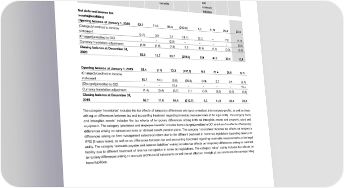 Notes to the Consolidated Financial Statements The movements in net deferred tax assets (liabilities) during the reporting period are as follows: in CHF million Inventories Fixed and Provisions Receivables Tax Trade Other TToottaall intangible and losses payables assets employee and benefits contract liabilities Net deferred income tax assets/(liabilities) Opening balance at January 1, 2020 6622..77 1111..66 8844..44 ((221122..00)) 88..33 4411..99 2266..44 2233..33 (Charged)/credited to income statement (2.2) 3.9 3.1 (11.1) (2.0) – 7.0 (1.3) (Charged)/credited to OCI – – (2.0) – – – – (2.0) Currency translation adjustment (4.9) (1.8) (1.8) 3.6 (0.4) (1.3) (3.0) (9.6) Closing balance at December 31, 2020 5555..66 1133..77 8833..77 ((221199..55)) 55..99 4400..66 3300..44 1100..44 Opening balance at January 1, 2019 5533..44 ((33..66)) 7722..33 ((118822..88)) 99..55 3377..44 2266..66 1122..88 (Charged)/credited to income statement 10.7 18.6 (0.6) (36.3) (0.9) 5.7 0.1 (2.7) (Charged)/credited to OCI – – 13.4 – – – – 13.4 Currency translation adjustment (1.4) (3.4) (0.7) 7.1 (0.3) (1.2) (0.3) (0.2) Closing balance at December 31, 2019 6622..77 1111..66 8844..44 ((221122..00)) 88..33 4411..99 2266..44 2233..33 The category ‘inventories’ includes the tax effects of temporary differences arising on unrealized intercompany profits, as well as those arising on differences between tax and accounting treatment regarding inventory measurements at the legal entity. The category ‘fixed and intangible assets’ includes the tax effects of temporary differences arising both on intangible assets and property, plant and equipment. The category ‘provisions and employee benefits’ includes items charged/credited to OCI which are tax effects of temporary differences arising on remeasurements on defined benefit pension plans. The category ‘receivables’ includes tax effects on temporary differences arising on fleet management sales/receivables due to the different treatment in some tax legislations (operating lease) and IFRS (finance lease), as well as on differences between tax and accounting treatment regarding receivable measurements at the legal entity. The category ‘accounts payable and contract liabilities’ mainly includes tax effects on temporary differences arising on contract liability due to different treatment of revenue recognition in some tax legislations. The category ‘other’ mainly includes tax effects on temporary differences arising on accruals and financial instruments as well the net effect on the right of use assets and the corresponding lease liabilities. 2020 Financial Report | 43