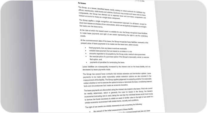 Notes to the Consolidated Financial Statements (2.9) Leases The Group assesses at the contract inception whether a contract is, or contains, a lease. That is, if the contract conveys the right to control the use of an identified asset for a period of time in exchange for consideration. As lessee The Group, as a lessee, identified leases mainly relating to rental contracts for buildings (e.g. offices, warehouses, retail stores) and vehicles. Contracts may contain both lease and non-lease components, the Group has elected not to separate lease and non-lease components and instead accounts for these as a single lease component. The Group applies a single recognition and measurement approach for all leases, except for short-term leases and leases of low-value assets, which are recognized as expense on a straight- line basis over the lease terms. At the date at which the leased asset is available for use, the Group recognizes lease liabilities to make lease payments and right of use assets representing the right to use the underlying assets. At the commencement date of the lease, the Group recognizes lease liabilities measured at the present value of lease payments to be made over the lease term, which include: • fixed payments, less any lease incentives receivable • variable lease payment that are based on an index or a rate • amounts expected to be payable by the Group under residual value guarantees • the exercise price of a purchase option if the Group is reasonably certain to exercise that option, and • payments of penalties for terminating the lease. Lease liabilities are subsequently increased by the interest cost on the lease liability and are decreased by lease payments made. The Group has several lease contracts that include extension and termination options. Lease payments to be made under reasonably certain extension options are also included in the measurement of the liability. The Group applies judgement in evaluating whether it is reasonably certain whether or not to exercise the option to renew or terminate the lease, considering relevant facts and circumstances that create an economic incentive. The lease payments are discounted using the interest rate implicit in the lease. If that rate cannot be readily determined, which is generally the case for leases in the Group, the lessee’s incremental borrowing rate is used, being the rate that the individual lessee would have to pay to borrow the funds necessary to obtain an asset of similar value to the right of use asset in a similar economic environment with similar terms, security and conditions. The right of use assets are initially measured at cost comprising the following: • the amount of the initial measurement of lease liability • any lease payments made at or before the commencement date less any lease incentives received • any initial direct costs, and • restoration costs. Subsequently, the right of use assets are measured at cost less any accumulated depreciation and impairment losses and adjusted for any remeasurement of lease liabilities. Right of use assets are generally depreciated over the shorter of the asset's useful life and the lease term on a straight-line basis. If the Group is reasonably certain to exercise a purchase 2020 Financial Report | 23