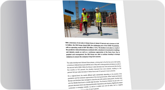 Management Report Management Report FINANCIALLY SOLID DESPITE A CHALLENGING COVID-19 Reaction to the COVID-19 pandemic At the end of March, Hilti launched a four-pillar program to cope with the COVID-19 challenges. A strong emphasis was put on protecting the health of Hilti’s employees and particularly the PANDEMIC YEAR sales force, resulting in significantly less time being spent with customers and on jobsites during the (partial) lockdowns. Additionally, the Group implemented a hiring freeze, optimized indirect Management Report cost expenditures (such as travel, events, etc.) and implemented temporary measures to gain time before deciding upon structural adjustments. At end of December 2020, the Group counted 29,549 team members, a decrease of 1.5 percent compared to the previous year. Hilti adjusted its structures only very selectively in certain markets and avoided Group-wide restructuring. At the same time, the Group continued to fully fund its strategic initiatives in the area of innovation, digitalization and cybersecurity with significant additional investments. Lastly, the Hilti Group Picture increased its cash reserve through net working capital optimization and debt increase to a total A139946.tif cash position of CHF 1.3 billion (2019: 1.1 billion). Height: 7.2 cm Continued investments in Despite the pandemic, the Hilti Group launched 74 new, innovative products and services onto Width: 12 cm innovations the market. A convincing example is the introduction of the Jaibot, a semi-autonomous mobile ceiling-drilling robot. Expenditure for research and development reached CHF 358 million, a share of 6.7 percent of net sales. With the additional expansion of integrated solutions combining products, software elements and services, Hilti continues to provide innovative solutions to help customers be more productive, work more safely and enjoy greater success. Besides digitalization of customer- related processes, the Group also drove forward the digitalization of its corporate processes, such as a new people approach with an underlying HCM suite, and an accelerated rollout of a With a decrease of net sales in Swiss francs of almost 10 percent and a turnover of CHF sales process with a new CRM system. 5.3 billion, the Hilti Group closed 2020, the challenging year of the COVID-19 pandemic, with an operating result of CHF 728 million (-7.0%). The decline in net sales is a result of Disproportionate decrease of The operating result decreased by 7.0 percent to CHF 728 million (2019: CHF 783 million). Net the pandemic-induced lockdowns combined with a slowdown in investments in buildings operating result profit decreased slightly more to CHF 531 million (2019: CHF 591 million), due to a slightly higher and industry assets as well as a continuous appreciation of the Swiss franc. Due to income tax rate and extraordinary effects. Despite the decrease in sales, the significant negative prudent cost management, the Hilti Group was able to continue investing in strategic currency effect and the ongoing strategic investments, the return on sales (ROS) grew slightly initiatives to ensure the company’s long-term success. and reached a new high of 13.7 percent (2019: 13.3%). This is the result of solid margin development and prudent overall cost management. By contrast, the return on capital employed The sales development followed three phases: a strong start in the first two and a half months, (ROCE) decreased by 3.4 percentage points to 16.4 percent (2019: 19.8%) due to the lower a lockdown-induced decrease until the end of May and a heterogeneous yet steady recovery in capital turnover. This was caused by a combination of the buildup of a higher liquidity reserve, the second half of 2020. While the Group’s sales decrease was most pronounced after the first the implementation of IFRS 16, a negative currency mix of the capital employed and lower sales. five months at 16.3 percent, the situation improved from June onwards, resulting in a 9.6 Nevertheless, both ROS and ROCE continue to reside in or on the upper end of the strategic percent full year sales decrease in Swiss francs and 4.3 percent in local currencies. target corridors of 10-12 and 15-20 percent, respectively. On a regional level, the results differed quite substantially depending on the severity of the The free cash flow (before the acquisition and sale of Group companies) reached CHF 459 pandemic and the lockdown approaches of the local governments. While Central and Eastern million (2019: CHF 303 million) leading to a cash flow conversion rate of 86.5 percent. This was Europe and Northern Asia managed to close the year with positive sales growth, Southern Asia a result of a strong focus on net working capital optimization by carefully managing the inventory and the Middle East faced a double-digit decrease. The Americas finished the year with a 4.6 and accounts receivable combined with a temporary reduction in expenditures for the global percent decrease which was disproportionately impacted by Latin America. Significantly weaker modernization of infrastructure and workstations. currencies in emerging markets, as well as a weaker euro and US dollar, led to a negative currency impact on Group sales of over 5 percent. The pronounced negative development of the US dollar, euro and emerging markets exchange rates had – despite good natural hedging in the main currencies – a negative impact of CHF 61 million on the operating result (2019: CHF -27 million). Healthy balance sheet and solid The equity ratio was 1.7 percentage point above the previous year’s figure and 1.8 percentage liquidity points below pre-IFRS 16 implementation levels. With this, the equity ratio continues to be over 50 percent. Despite the effects mentioned earlier caused by the pandemic, the total cash position increased to CHF 1.3 billion (2019: CHF 1.1 billion). This was achieved by the strong free cash flow and an increase of the Group’s interest-bear