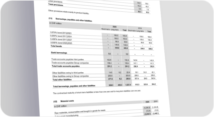 Notes to the Financial Statements Hilti Corporation Notes to the Financial Statements Hilti Corporation (10) Provisions (13) Personnel expenses in CHF million 22002200 2019 in CHF million 22002200 2019 Provision for employee benefits 35.0 36.6 Wages and salaries (253.2) (279.4) Tax obligations 46.2 49.4 Pension contributions (41.3) (42.0) Other provisions 3.9 7.5 Other social contributions (12.6) (17.7) Total provisions 8855..11 9933..55 Total personnel expenses ((330077..11)) ((333399..11)) Other provisions relate mainly to product liability. (14) Depreciation and amortization (11) Borrowings, payables and other liabilities This position comprises depreciation and amortization of intangible assets and property, plant and equipment. in CHF million 22002200 2019 (15) Financial revenues Short–term Long–term TToottaall Short–term Long–term TToottaall in CHF million 22002200 2019 1.875% bond 2013/2023 – 100.0 100.0 – 100.0 100.0 0.200% bond 2017/2024 – 100.0 100.0 – 100.0 100.0 Recovery of depreciation on financial assets 00..99 77..00 0.400% bond 2017/2027 – 99.9 99.9 – 99.9 99.9 0.050% bond 2020/2025 –– 149.9 149.9 –– –– –– Financial investment revenues from third parties 1.5 1.7 Total bonds –– 444499..88 444499..88 –– 229999..99 229999..99 Financial investment revenues from Group companies 184.7 65.8 Total revenues from financial investments 118866..22 6677..55 Bank borrowings 00..22 –– 00..22 –– –– –– Revenues from cash and marketable securities invested with third parties – – Trade accounts payables third parties 152.8 – 152.8 145.8 – 145.8 Revenues from cash and marketable securities invested with Group companies – – Trade accounts payables Group companies 138.4 – 138.4 147.1 – 147.1 Total revenues from cash and marketable securities –– –– Total trade accounts payables 229911..22 –– 229911..22 229922..99 –– 229922..99 Total financial revenues 118877..11 7744..55 Other liabilities owing to third parties 14.6 8.2 22.8 18.1 24.0 42.1 Other liabilities owing to Group companies 263.0 – 263.0 299.3 – 299.3 (16) Financial expenses Total other liabilities 227777..66 88..22 228855..88 331177..44 2244..00 334411..44 in CHF million 22002200 2019 Total borrowings, payables and other liabilities 556699..00 445588..00 11,,002277..00 661100..33 332233..99 993344..22 Depreciation on financial assets ((116633..77)) ((11..44)) The contractual maturity of short-term liabilities is less than one year and for long-term liabilities over one year. Interest and similar expenses incurred to third parties (5.7) (4.0) (12) Material costs Interest and similar expenses incurred to group companies (3.5) (2.3) Total interest and similar expenses ((99..22)) ((66..33)) in CHF million 22002200 2019 Operating currency and hedge gains/(losses) ((2200..44)) ((1155..11)) Raw materials, consumables and bought-in goods for resale (1,236.3) (1,434.9) Outsourced manufacturing (12.4) (13.2) Total financial expenses ((119933..33)) ((2222..88)) Total material costs ((11,,224488..77)) ((11,,444488..11)) 2020 Financial Report | 82 2020 Financial Report | 83