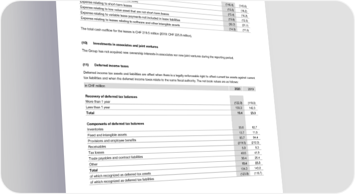 Notes to the Consolidated Financial Statements Notes to the Consolidated Financial Statements The consolidated income statement shows the following amounts relating to leases: The movements in net deferred tax assets (liabilities) during the reporting period are as follows: in CHF million 22002200 2019 in CHF million Inventories Fixed and Provisions Receivables Tax Trade Other TToottaall intangible and losses payables Depreciation (140.4) (143.6) assets employee and Interest expense (included in finance cost) (15.5) (18.2) benefits contract Expense relating to short-term leases (13.4) (16.3) liabilities Expense relating to low-value asset that are not short-term leases (13.8) (12.5) Expense relating to variable lease payments not included in lease liabilities (30.7) (31.1) Net deferred income tax Expense relating to leases relating to software and other intangible assets (14.3) (11.5) assets/(liabilities) Opening balance at January 1, 2020 6622..77 1111..66 8844..44 ((221122..00)) 88..33 4411..99 2266..44 2233..33 The total cash outflow for the leases is CHF 219.5 million (2019: CHF 225.8 million). (Charged)/credited to income statement (2.2) 3.9 3.1 (11.1) (2.0) – 7.0 (1.3) (Charged)/credited to OCI – – (2.0) – – – – (2.0) (10) Investments in associates and joint ventures Currency translation adjustment (4.9) (1.8) (1.8) 3.6 (0.4) (1.3) (3.0) (9.6) Closing balance at December 31, The Group has not acquired new ownership interests in associates nor new joint ventures during the reporting period. 2020 5555..66 1133..77 8833..77 ((221199..55)) 55..99 4400..66 3300..44 1100..44 (11) Deferred income taxes Opening balance at January 1, 2019 5533..44 ((33..66)) 7722..33 ((118822..88)) 99..55 3377..44 2266..66 1122..88 Deferred income tax assets and liabilities are offset when there is a legally enforceable right to offset current tax assets against current (Charged)/credited to income tax liabilities and when the deferred income taxes relate to the same fiscal authority. The net book values are as follows: statement 10.7 18.6 (0.6) (36.3) (0.9) 5.7 0.1 (2.7) in CHF million 22002200 2019 (Charged)/credited to OCI – – 13.4 – – – – 13.4 Currency translation adjustment (1.4) (3.4) (0.7) 7.1 (0.3) (1.2) (0.3) (0.2) Recovery of deferred tax balances Closing balance at December 31, More than 1 year (122.9) (119.0) 2019 6622..77 1111..66 8844..44 ((221122..00)) 88..33 4411..99 2266..44 2233..33 Less than 1 year 133.3 142.3 Total 1100..44 2233..33 The category ‘inventories’ includes the tax effects of temporary differences arising on unrealized intercompany profits, as well as those arising on differences between tax and accounting treatment regarding inventory measurements at the legal entity. The category ‘fixed Components of deferred tax balances and intangible assets’ includes the tax effects of temporary differences arising both on intangible assets and property, plant and Inventories 55.6 62.7 equipment. The category ‘provisions and employee benefits’ includes items charged/credited to OCI which are tax effects of temporary Fixed and intangible assets 13.7 11.6 differences arising on remeasurements on defined benefit pension plans. The category ‘receivables’ includes tax effects on temporary Provisions and employee benefits 83.7 84.4 differences arising on fleet management sales/receivables due to the different treatment in some tax legislations (operating lease) and Receivables (219.5) (212.0) IFRS (finance lease), as well as on differences between tax and accounting treatment regarding receivable measurements at the legal Tax losses 5.9 8.3 entity. The category ‘accounts payable and contract liabilities’ mainly includes tax effects on temporary differences arising on contract Trade payables and contract liabilities 40.6 41.9 liability due to different treatment of revenue recognition in some tax legislations. The category ‘other’ mainly includes tax effects on Other 30.4 26.4 temporary differences arising on accruals and financial instruments as well the net effect on the right of use assets and the corresponding Total 1100..44 2233..33 lease liabilities. of which recognized as deferred tax assets 134.3 143.0 of which recognized as deferred tax liabilities (123.9) (119.7) 2020 Financial Report | 42 2020 Financial Report | 43
