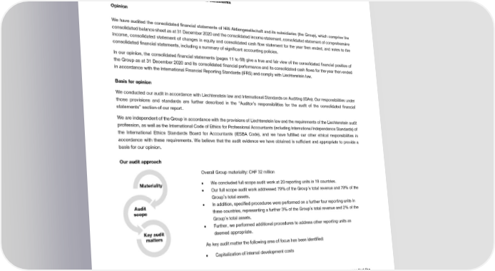 Auditors’ Report on the Consolidated Financial Statements REPORT OF THE STATUTORY AUDITOR TO THE GENERAL MEETING OF HILTI AKTIENGESELLSCHAFT, SCHAAN Report on the audit of the consolidated financial statements Opinion We have audited the consolidated financial statements of Hilti Aktiengesellschaft and its subsidiaries (the Group), which comprise the consolidated balance sheet as at 31 December 2020 and the consolidated income statement, consolidated statement of comprehensive income, consolidated statement of changes in equity and consolidated cash flow statement for the year then ended, and notes to the consolidated financial statements, including a summary of significant accounting policies. In our opinion, the consolidated financial statements (pages 11 to 68) give a true and fair view of the consolidated financial position of the Group as at 31 December 2020 and its consolidated financial performance and its consolidated cash flows for the year then ended in accordance with the International Financial Reporting Standards (IFRS) and comply with Liechtenstein law. Basis for opinion We conducted our audit in accordance with Liechtenstein law and International Standards on Auditing (ISAs). Our responsibilities under those provisions and standards are further described in the “Auditor’s responsibilities for the audit of the consolidated financial statements” section of our report. We are independent of the Group in accordance with the provisions of Liechtenstein law and the requirements of the Liechtenstein audit profession, as well as the International Code of Ethics for Professional Accountants (including International Independence Standards) of the International Ethics Standards Board for Accountants (IESBA Code), and we have fulfilled our other ethical responsibilities in accordance with these requirements. We believe that the audit evidence we have obtained is sufficient and appropriate to provide a basis for our opinion. Our audit approach Overall Group materiality: CHF 32 million Materiality • We concluded full scope audit work at 20 reporting units in 19 countries. • Our full scope audit work addressed 79% of the Group’s total revenue and 79% of the Group’s total assets. Audit • In addition, specified procedures were performed on a further four reporting units in scope three countries, representing a further 3% of the Group’s total revenue and 2% of the Group’s total assets. • Further, we performed additional procedures to address other reporting units as Key audit deemed appropriate. matters As key audit matter the following area of focus has been identified: • Capitalization of internal development costs Materiality The scope of our audit was influenced by our application of materiality. Our audit opinion aims to provide reasonable assurance that the consolidated financial statements are free from material misstatement. Misstatements may arise due to fraud or error. They are considered material if, individually or in aggregate, they could reasonably be expected to influence the economic decisions of users taken on the basis of the consolidated financial statements. Based on our professional judgement, we determined certain quantitative thresholds for materiality, including the overall Group materiality for the consolidated financial statements as a whole as set out in the table below. These, together with qualitative considerations, helped us to determine the scope of our audit and the nature, timing and extent of our audit procedures and to evaluate the effect of misstatements, both individually and in aggregate, on the consolidated financial statements as a whole. 2020 Financial Report | 69