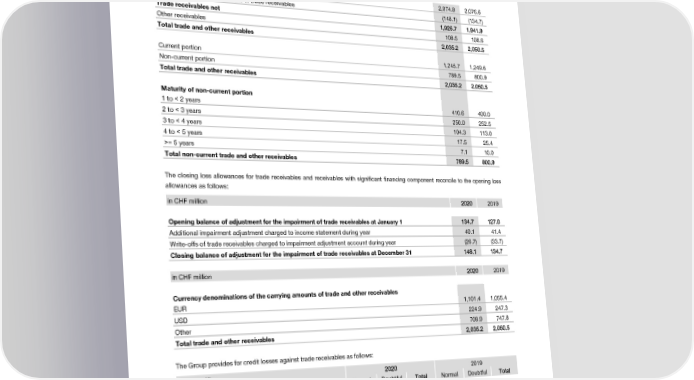 Notes to the Consolidated Financial Statements (14) Trade and other receivables in CHF million 22002200 2019 Trade receivables 2,074.8 2,076.6 Less adjustment for impairment of trade receivables (148.1) (134.7) Trade receivables net 11,,992266..77 11,,994411..99 Other receivables 108.5 108.6 Total trade and other receivables 22,,003355..22 22,,005500..55 Current portion 1,245.7 1,249.6 Non-current portion 789.5 800.9 Total trade and other receivables 22,,003355..22 22,,005500..55 Maturity of non-current portion 1 to < 2 years 410.6 400.0 2 to < 3 years 250.0 252.5 3 to < 4 years 104.3 113.0 4 to < 5 years 17.5 25.4 >= 5 years 7.1 10.0 Total non-current trade and other receivables 778899..55 880000..99 The closing loss allowances for trade receivables and receivables with significant financing component reconcile to the opening loss allowances as follows: in CHF million 22002200 2019 Opening balance of adjustment for the impairment of trade receivables at January 1 113344..77 112277..00 Additional impairment adjustment charged to income statement during year 40.1 41.4 Write-offs of trade receivables charged to impairment adjustment account during year (26.7) (33.7) Closing balance of adjustment for the impairment of trade receivables at December 31 114488..11 113344..77 in CHF million 22002200 2019 Currency denominations of the carrying amounts of trade and other receivables EUR 1,101.4 1,055.4 USD 224.9 247.3 Other 708.9 747.8 Total trade and other receivables 22,,003355..22 22,,005500..55 The Group provides for credit losses against trade receivables as follows: in CHF million 22002200 2019 Normal Doubtful TToottaall Normal Doubtful TToottaall Gross carrying amount receivables without significant financing component 726.9 71.5 779988..44 803.4 66.9 887700..33 Gross carrying amount receivables with significant financing component 1,359.5 25.4 11,,338844..99 1,292.4 22.5 11,,331144..99 Loss allowance provisions 58.3 89.8 114488..11 53.9 80.8 113344..77 2020 Financial Report | 45