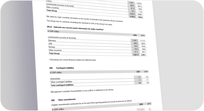 Notes to the Consolidated Financial Statements (34.3) Net sales information for major countries in CHF million 22002200 2019 USA 1,100.1 1,219.8 Germany 826.3 834.4 France 417.2 476.0 Liechtenstein (country of domicile) 63.4 71.6 Other countries 2,925.2 3,298.1 Total Group 55,,333322..22 55,,889999..99 Net sales by major countries are based on the country of domicile of the respective Group companies. The Group has no customer exceeding the threshold of 10% of the Group’s net sales. (34.4) Selected non-current assets information for major countries* in CHF million 22002200 2019 Liechtenstein (country of domicile) 1,188.7 1,117.0 Germany 286.0 259.9 USA 148.5 164.6 Norway 133.0 149.9 Other countries 571.1 591.7 Total Group 22,,332277..33 22,,228833..11 * Excluding non-current financial assets and deferred taxes (35) Contingent liabilities in CHF million 22002200 2019 Guarantees 3.7 5.6 Other contingent liabilities 1.7 1.7 Total contingent liabilities 55..44 77..33 Management considers the possibility of any outflow in settlement to be remote. (36) Other commitments Capital commitments contracted for at the end of the reporting period but not yet incurred are as follows: in CHF million 22002200 2019 Intangible assets – 0.1 Property, plant and equipment 18.0 17.7 Total at December 31 1188..00 1177..88 (37) Financial assets pledged as collateral Details of receivables pledged as collateral for recognized liabilities are given in note (14). There are no other financial assets pledged as collateral for recognized liabilities or for contingent liabilities. 2020 Financial Report | 63