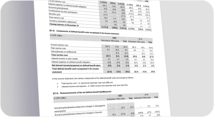 Notes to the Consolidated Financial Statements (21.3) Reconciliation of present value of defined benefit obligation in CHF million 22002200 2019 Switzerland Other plans TToottaall Switzerland Other plans TToottaall Opening balance at January 1 ((11,,227766..66)) ((333333..44)) ((11,,661100..00)) ((11,,115533..55)) ((330022..44)) ((11,,445555..99)) Current service cost (35.1) (7.6) (42.7) (29.1) (8.4) (37.5) Interest expense on defined benefit obligation (3.2) (4.8) (8.0) (8.7) (7.0) (15.7) Actuarial gains/(losses) 5.1 (14.1) (9.0) (113.4) (29.3) (142.7) Contributions by plan participants (17.7) – (17.7) (17.1) – (17.1) Benefits paid 43.2 11.0 54.2 36.6 7.9 44.5 Past service cost 8.4 (0.4) 8.0 8.6 1.7 10.3 Currency translation adjustment – 9.8 9.8 – 4.1 4.1 Closing balance at December 31 ((11,,227755..99)) ((333399..55)) ((11,,661155..44)) ((11,,227766..66)) ((333333..44)) ((11,,661100..00)) (21.4) Components of defined benefit costs recognized in the income statement in CHF million 22002200 2019 Switzerland Other plans TToottaall Switzerland Other plans TToottaall Current service cost (35.1) (7.6) (42.7) (29.1) (8.4) (37.5) Past service cost 8.4 (0.4) 8.0 8.6 1.7 10.3 Gains/(losses) on settlements – (0.1) (0.1) – (0.1) (0.1) Total service cost ((2266..77)) ((88..11)) ((3344..88)) ((2200..55)) ((66..88)) ((2277..33)) Interest income on plan assets 2.3 2.3 4.6 6.7 3.3 10.0 Interest expense on defined benefit obligation (3.2) (4.8) (8.0) (8.7) (7.0) (15.7) Net interest income/(expense) on defined benefit plans ((00..99)) ((22..55)) ((33..44)) ((22..00)) ((33..77)) ((55..77)) Total defined benefit costs recognized in the income statement ((2277..66)) ((1100..66)) ((3388..22)) ((2222..55)) ((1100..55)) ((3333..00)) In the income statement, the various components of the defined benefit costs are included as follows: • Total service cost – in ‘personnel expenses’ (see note (29)) and • Interest income and expense – in ‘other income and expenses (net)’ (see note (31)). (21.5) Remeasurements of the net defined benefit (liability)/asset in CHF million 22002200 2019 Switzerland Other plans TToottaall Switzerland Other plans TToottaall Actuarial gains/(losses) arising from changes in demographic assumptions – (0.7) (0.7) – 13.5 13.5 Actuarial gains/(losses) arising from changes in financial assumptions 12.4 (17.3) (4.9) (105.8) (47.5) (153.3) Actuarial gains/(losses) arising from experience adjustments (7.3) 3.9 (3.4) (7.6) 4.7 (2.9) Total actuarial gains/(losses) on defined benefit obligation 55..11 ((1144..11)) ((99..00)) ((111133..44)) ((2299..33)) ((114422..77)) Return on plan assets excluding interest income 19.9 7.7 27.6 53.2 7.8 61.0 Total remeasurements recorded in other comprehensive income 2255..00 ((66..44)) 1188..66 ((6600..22)) ((2211..55)) ((8811..77)) 2020 Financial Report | 55