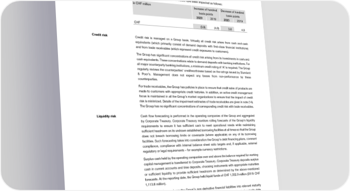 Notes to the Consolidated Financial Statements Notes to the Consolidated Financial Statements Separate simulations of the impact of interest rate changes on each of the Swiss franc, euro and in CHF million Less than 1 Between 1 Between 2 Over 5 years US dollar investment holdings have not been completed since an increase/decrease of one year and 2 years and 5 years hundred basis points is considered reasonably possible for each of the three currencies. Due to interest rate derivatives, OCI would have been impacted as follows: At December 31, 2020 Bonds and borrowings 145.5 29.9 369.7 101.1 in CHF million Increase of hundred Decrease of hundred Lease liabilities 126.3 102.7 159.1 105.8 basis points basis points Trade and other payables 468.4 2.0 7.8 8.0 22002200 2019 22002200 2019 in CHF million Less than 1 Between 1 Between 2 Over 5 years CHF (3.8) (4.9) 3.8 4.9 year and 2 years and 5 years At December 31, 2019 Credit risk Credit risk is managed on a Group basis. Virtually all credit risk arises from cash and cash Bonds and borrowings 228.5 40.1 222.0 101.1 equivalents (which primarily consist of demand deposits with first-class financial institutions) Lease liabilities 131.6 98.0 177.0 95.1 and from trade receivables (which represent credit exposures to customers). Trade and other payables 471.7 4.3 23.8 8.1 The Group has significant concentrations of credit risk arising from its investments in cash and cash equivalents. These concentrations relate to demand deposits with banking institutions. For Most of the non-trading Group’s gross or net settled derivative financial instruments are in hedge all major counterparty banking institutions, a minimum credit rating of ‘A’ is required. The Group relationships and are due to be settled gross or net within 12 months of the balance sheet date. regularly reviews the counterparties’ creditworthiness based on the ratings issued by Standard These contracts require undiscounted contractual cash inflows of CHF 626.4 million (2019: CHF & Poor’s. Management does not expect any losses from non-performance by these 802.1 million) and undiscounted contractual cash outflows of CHF 630.4 million (2019: CHF counterparties. 803.5 million). All of the non-trading Group’s derivative financial instruments are in hedge relationships and are disclosed in note (16). Group has policies in place to ensure that credit sales of products are For trade receivables, the made to customers with appropriate credit histories. In addition, an active credit management focus is maintained in all the Group’s market organizations to ensure that the impact of credit risk is minimized. Details of the impairment estimates of trade receivables are given in note (14). The Group has no significant concentrations of corresponding credit risk with trade receivables. Liquidity risk Cash flow forecasting is performed in the operating companies of the Group and aggregated by Corporate Treasury. Corporate Treasury monitors rolling forecasts of the Group’s liquidity requirements to ensure it has sufficient cash to meet operational needs while maintaining sufficient headroom on its undrawn established borrowing facilities at all times so that the Group does not breach borrowing limits or covenants (where applicable) on any of its borrowing facilities. Such forecasting takes into consideration the Group’s debt financing plans, covenant compliance, compliance with internal balance sheet ratio targets and, if applicable, external regulatory or legal requirements – for example currency restrictions. balance required for working Surplus cash held by the operating companies over and above the capital management is transferred to Corporate Treasury. Corporate Treasury deposits surplus cash in current accounts and time deposits, choosing instruments with appropriate maturities or sufficient liquidity to provide sufficient headroom as determined by the above-mentioned forecasts. At the reporting date, the Group held liquid funds of CHF 1,332.9 million (2019: CHF 1,113.8 million). derivative financial liabilities into relevant maturity The table below analyzes the Group’s non- Groupings based on the periods from the balance sheet date to the contractual maturity date. The amounts disclosed in the table are the contractual undiscounted cash flows including future interest payments: 2020 Financial Report | 30 2020 Financial Report | 31
