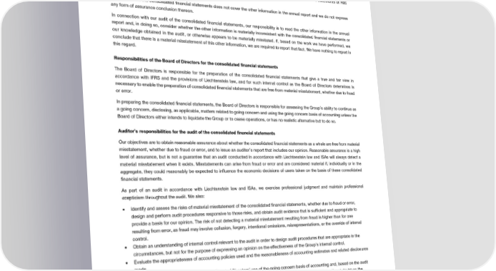 Auditors’ Report on the Consolidated Financial Statements Other information in the annual report The Board of Directors is responsible for the other information in the annual report. The other information comprises all information included in the annual report, but does not include the consolidated financial statements, the standalone financial statements of Hilti Aktiengesellschaft and our auditor’s reports thereon. Our opinion on the consolidated financial statements does not cover the other information in the annual report and we do not express any form of assurance conclusion thereon. In connection with our audit of the consolidated financial statements, our responsibility is to read the other information in the annual report and, in doing so, consider whether the other information is materially inconsistent with the consolidated financial statements or our knowledge obtained in the audit, or otherwise appears to be materially misstated. If, based on the work we have performed, we conclude that there is a material misstatement of this other information, we are required to report that fact. We have nothing to report in this regard. Responsibilities of the Board of Directors for the consolidated financial statements The Board of Directors is responsible for the preparation of the consolidated financial statements that give a true and fair view in accordance with IFRS and the provisions of Liechtenstein law, and for such internal control as the Board of Directors determines is necessary to enable the preparation of consolidated financial statements that are free from material misstatement, whether due to fraud or error. In preparing the consolidated financial statements, the Board of Directors is responsible for assessing the Group’s ability to continue as a going concern, disclosing, as applicable, matters related to going concern and using the going concern basis of accounting unless the Board of Directors either intends to liquidate the Group or to cease operations, or has no realistic alternative but to do so. Auditor’s responsibilities for the audit of the consolidated financial statements Our objectives are to obtain reasonable assurance about whether the consolidated financial statements as a whole are free from material misstatement, whether due to fraud or error, and to issue an auditor’s report that includes our opinion. Reasonable assurance is a high level of assurance, but is not a guarantee that an audit conducted in accordance with Liechtenstein law and ISAs will always detect a material misstatement when it exists. Misstatements can arise from fraud or error and are considered material if, individually or in the aggregate, they could reasonably be expected to influence the economic decisions of users taken on the basis of these consolidated financial statements. As part of an audit in accordance with Liechtenstein law and ISAs, we exercise professional judgment and maintain professional scepticism throughout the audit. We also: • Identify and assess the risks of material misstatement of the consolidated financial statements, whether due to fraud or error, design and perform audit procedures responsive to those risks, and obtain audit evidence that is sufficient and appropriate to provide a basis for our opinion. The risk of not detecting a material misstatement resulting from fraud is higher than for one resulting from error, as fraud may involve collusion, forgery, intentional omissions, misrepresentations, or the override of internal control. • Obtain an understanding of internal control relevant to the audit in order to design audit procedures that are appropriate in the circumstances, but not for the purpose of expressing an opinion on the effectiveness of the Group’s internal control. • Evaluate the appropriateness of accounting policies used and the reasonableness of accounting estimates and related disclosures made. • Conclude on the appropriateness of the Board of Directors’ use of the going concern basis of accounting and, based on the audit evidence obtained, whether a material uncertainty exists related to events or conditions that may cast significant doubt on the Group’s ability to continue as a going concern. If we conclude that a material uncertainty exists, we are required to draw attention in our auditor’s report to the related disclosures in the consolidated financial statements or, if such disclosures are inadequate, to modify our opinion. Our conclusions are based on the audit evidence obtained up to the date of our auditor’s report. However, future events or conditions may cause the Group to cease to continue as a going concern. • Evaluate the overall presentation, structure and content of the consolidated financial statements, including the disclosures, and whether the consolidated financial statements represent the underlying transactions and events in a manner that achieves fair presentation. 2020 Financial Report | 71
